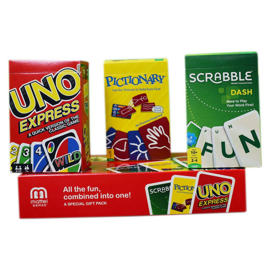 Mattel Games UNO Express, Pictionary, Scrabble Dash Pack of 3Vendor: UNOPack smart and save with this brilliant triple-pack of classic Mattel Gaming favourites! Perfect for busy families on the move, these compact card versions of UNO Express, Pictionary, and Scrabble Dash are ideal for travel, rainy days, and quick family fun sessions. These mini...