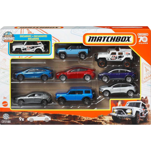 Matchbox Adventures World Tour 9-Pack 70 Years Edition Car SetVendor: MatchboxTreat your little adventurers to this special 9-car Matchbox collection that brings global exploration home! Perfect for busy parents who want to maximise value, this World Tour set features nine detailed 1:64 scale vehicles, including an exclusive rare car you won't find anywhere else....