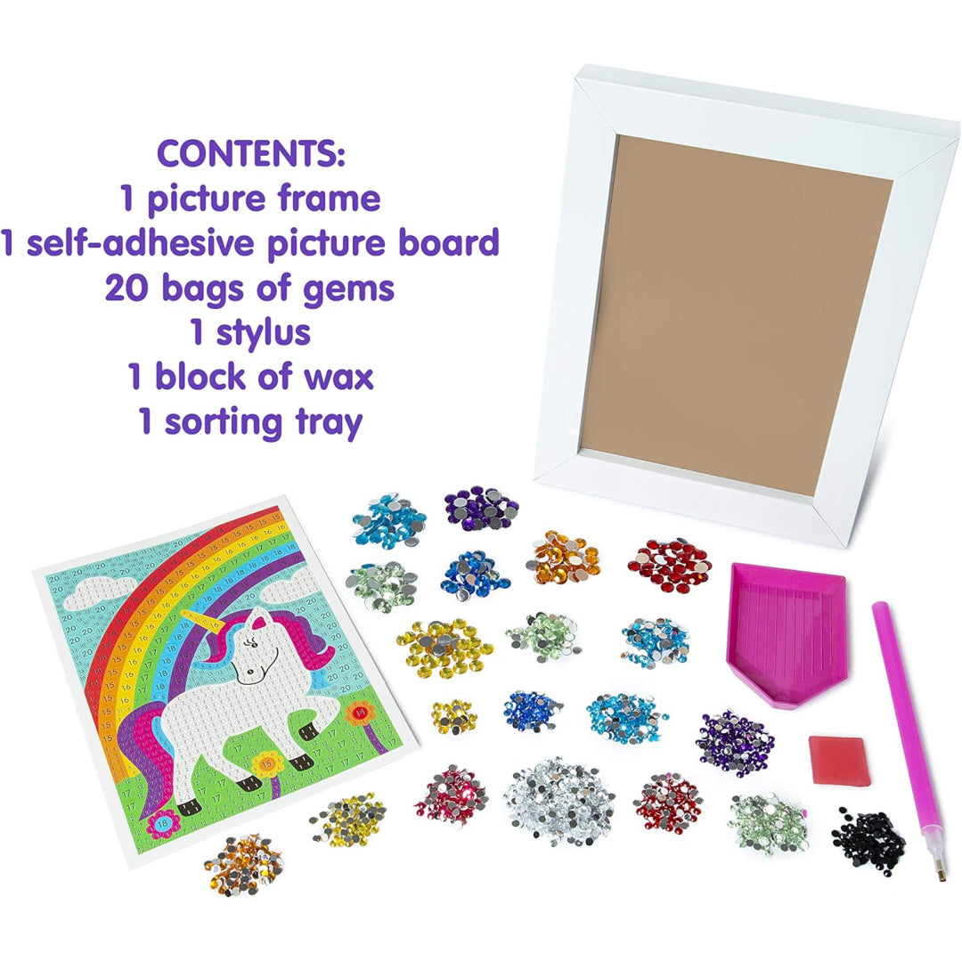 Everything needed comes in one box, which means no last-minute dashes to the shops for extras. You get a picture frame, self-adhesive picture board, 20 bags of colourful gems in assorted sizes, a wax-tipped stylus, and a sorting tray. The process is wonderfully simple: peel away the protective sheet to reveal the sticky surface, pour the gems into the tray, dip the stylus in wax, and press each sparkling gem into place to build up a gorgeous unicorn scene. Easy-to-follow instructions guide young crafters through each step, making it suitable for beginners and experienced little makers alike.