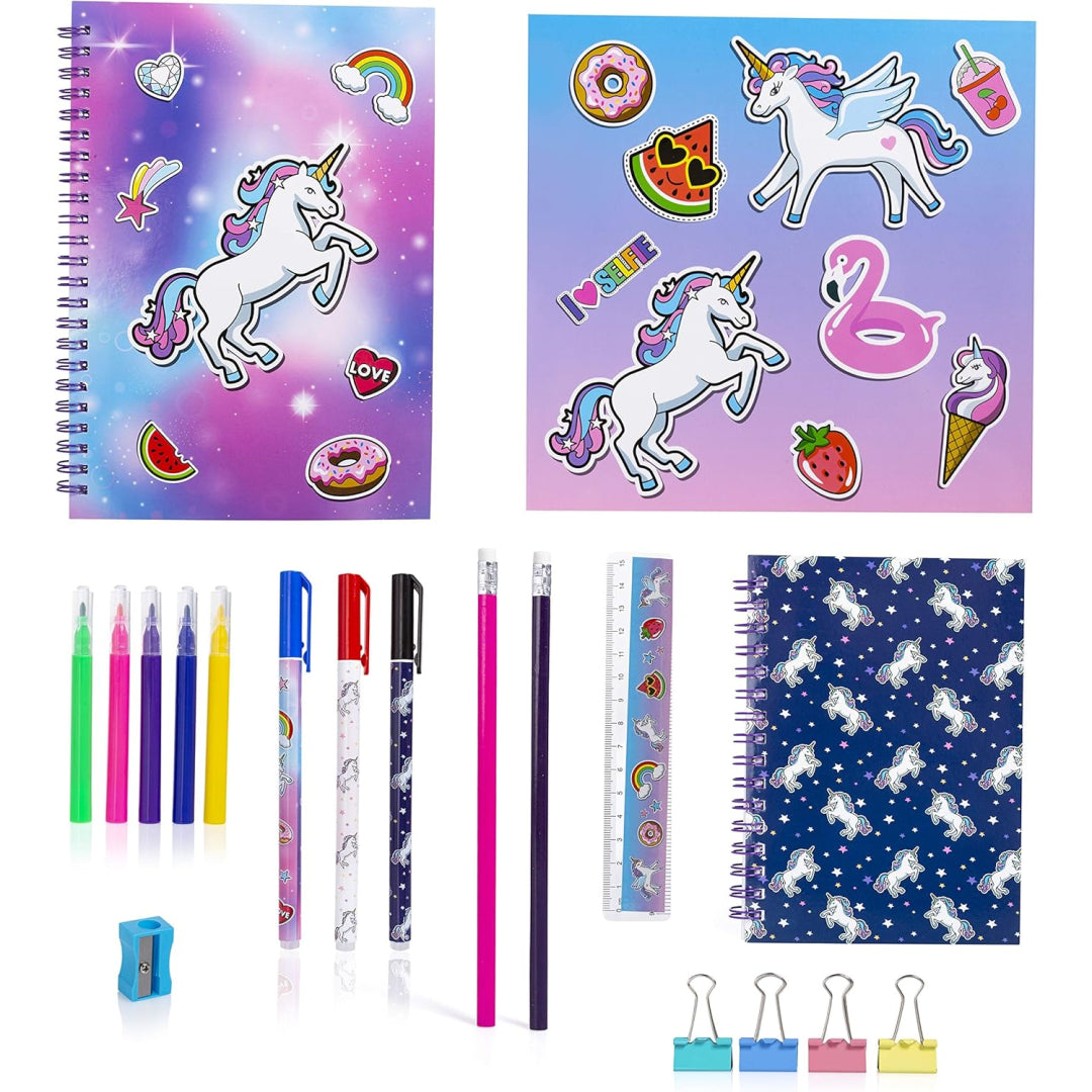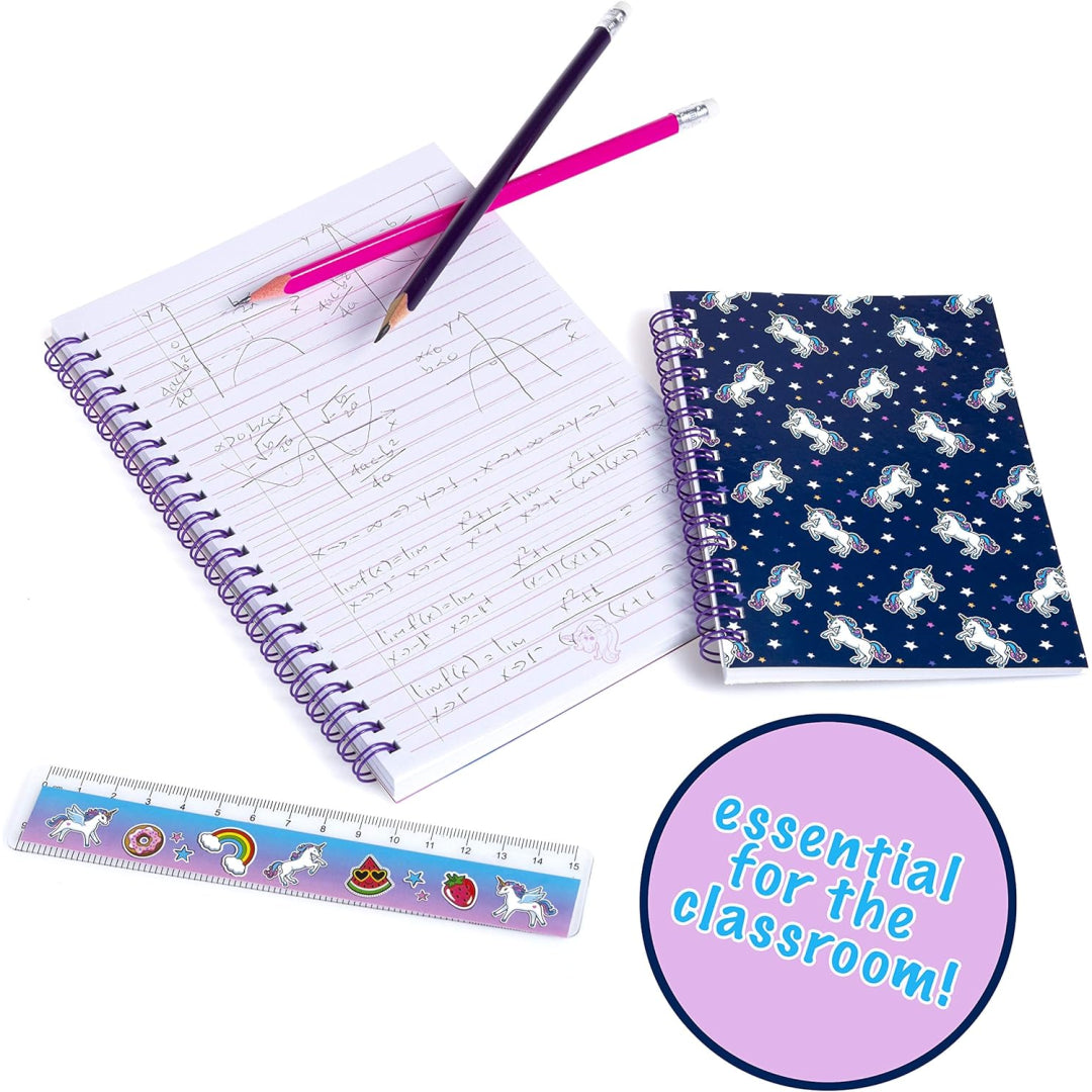 Inside, you'll find an A5 notebook and an A6 notebook for all those big ideas and little lists, 3 colourful pens, 2 pencils, a pencil sharpener, 5 mini felt-tip pens, a 15cm ruler, 4 mini clips, and a sticker book bursting with adorable unicorn designs. Everything slots neatly into school bags or pairs perfectly with existing pencil cases and supplies, making it ideal for topping up the stationery drawer or pulling together a birthday surprise.