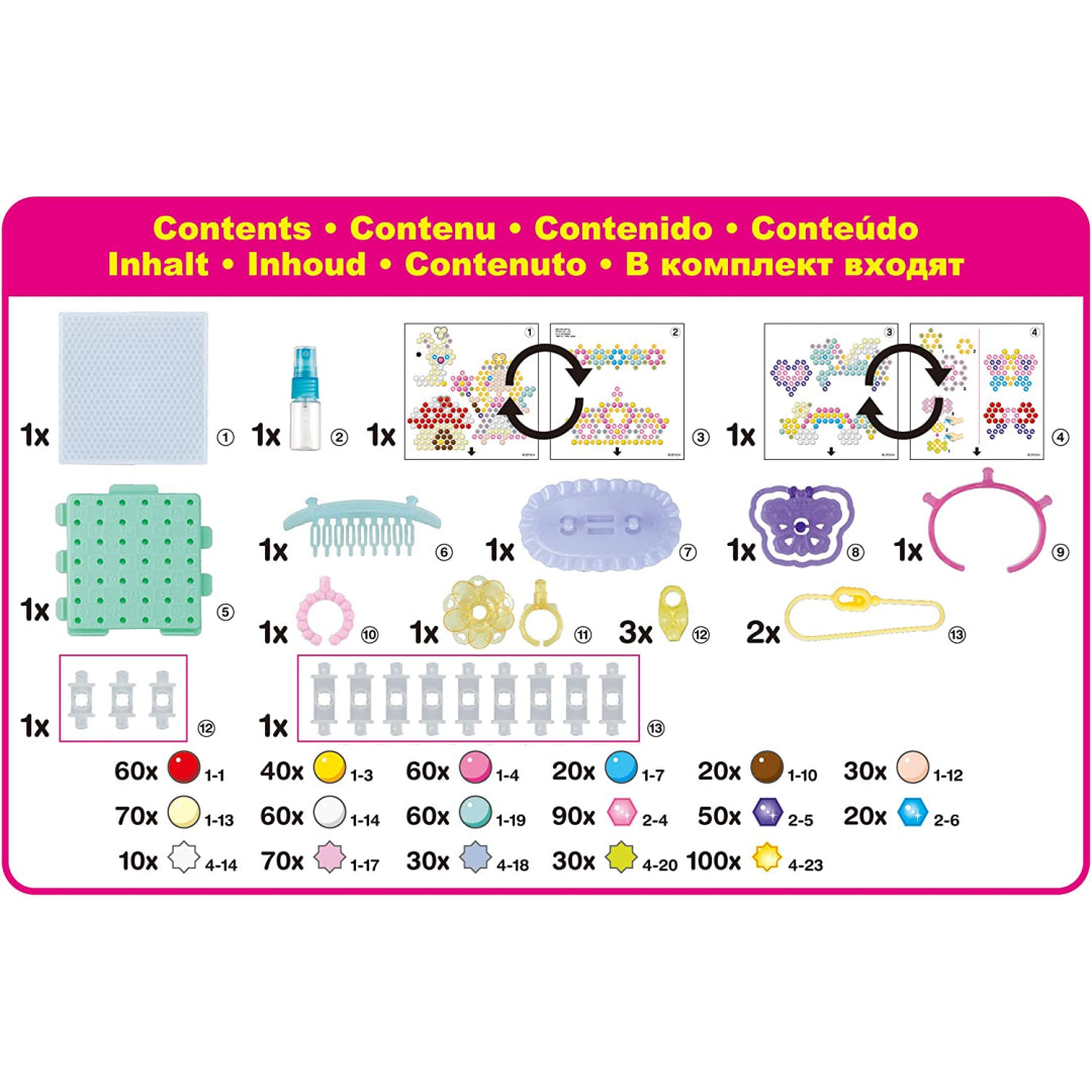 More than 820 beads in 16 colours, wearable accessory bases (tiara, barretta, bracelet, brooch, rings, charm accessories), creation display, design pegs, layout tray, sprayer, template papers, and instructions are all included in this comprehensive arts and crafts bead kit. Fairy, rabbit, mushroom house, flower, and other adorable themes are among the template patterns that may be created by adhering provided star, solid, and jewel beads to the tray.