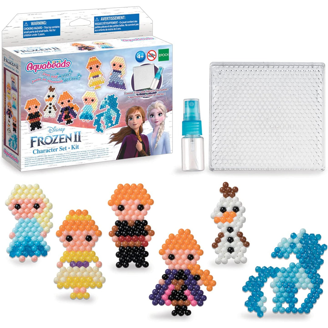 Over 800 solid, gem, and star beads in 17 different hues are included in the Frozen II Character Set, together with a layout tray, sprayer, template papers, and instructions. To make Anna, Elsa, Olaf, Sven, and Kristoff, as well as the brand-new character Nokk, arrange the beads into the layout tray in the order specified by the template design. Spraying the beads with water from the sprayer will somehow cause them to miraculously adhere to one another. Bead patterns may be expanded upon by using the full, refill, and accessory sets of Aquabeads together in cooperative play.