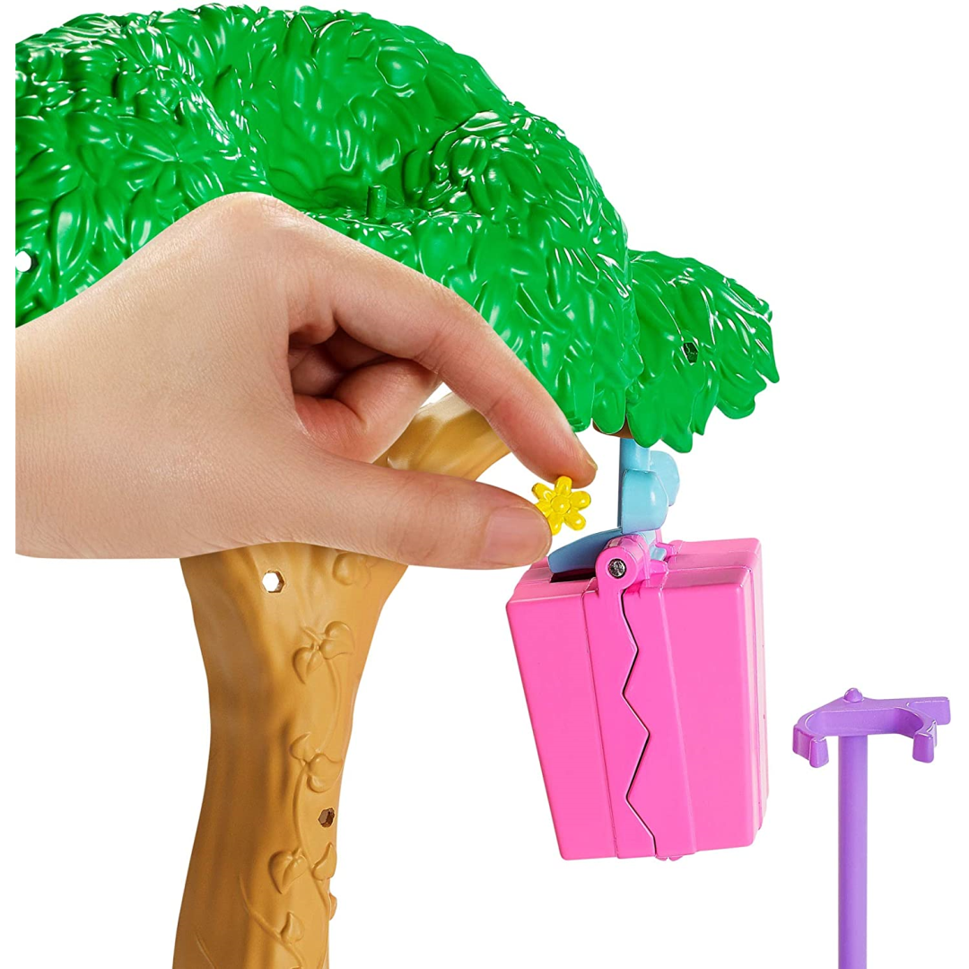 Barbie and Chelsea The Lost Birthday-inspired dolls and playsets engage young imaginations on journeys filled with discovery and animal buddies! Chelsea doll is having a birthday party with her baby animal friends and a large present full of surprises. Chelsea doll and her monkey pal may be clipped into the playset, then spun to assist Chelsea doll in swinging at the surprise reveal item. A rainbow of plug-and-play attachments will shoot out as it opens! Decorate the tree and Chelsea doll's cake with them, then celebrate with her baby sloth and monkey mates, who can be plugged into the playset for fun of active play and imaginative storytelling! Doll is unable to stand on her own. Colours and decorations are subject to change.