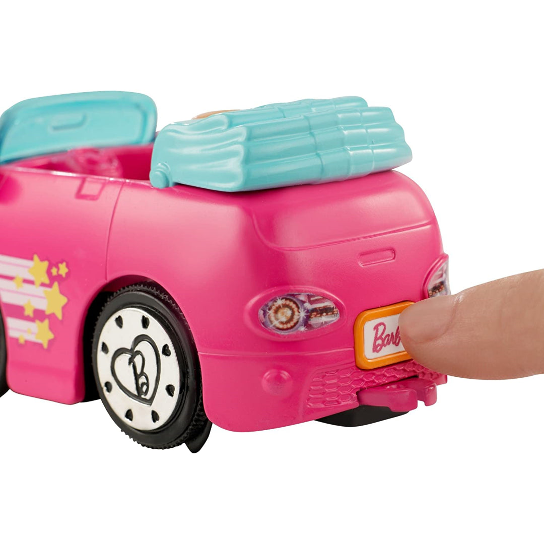 The approximately 10 centimeter-tall doll wears a one-of-a-kind outfit that matches the car, complete with pink trousers, a striped top, and removable pink sunglasses. The automobile is adorned with blue details, star decals, silver wheels, and headlights in the shape of a heart.