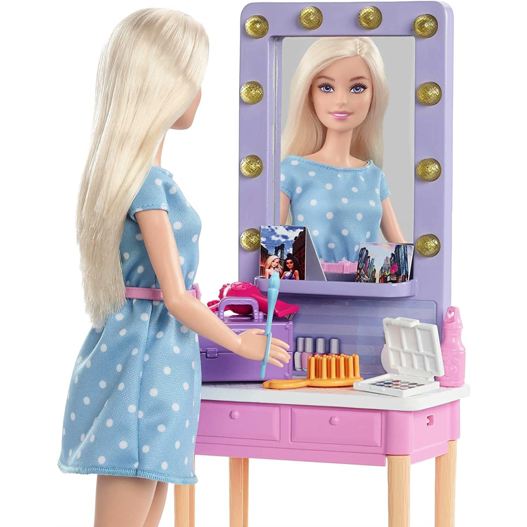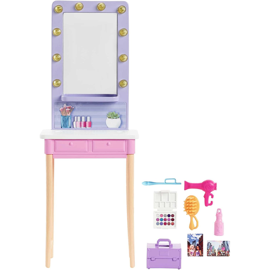 Transform playtime into a theatrical adventure with the included dressing table and vanity mirror setup. Your little star can use the stool and accessories - including a hairbrush, hairdryer, makeup compact and carrying case - to get Barbie ready for her big performance. The portable design means the fun can continue from bedroom to playroom and beyond!