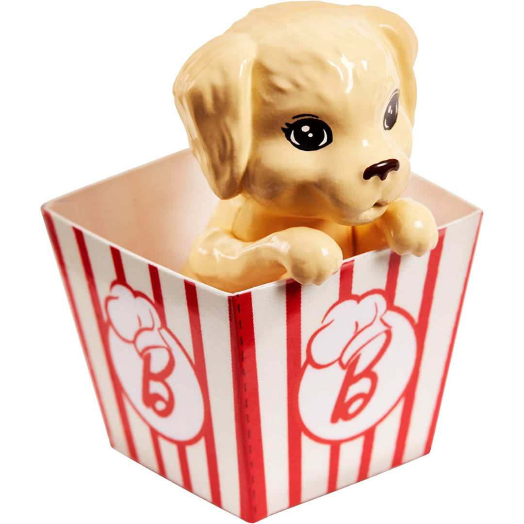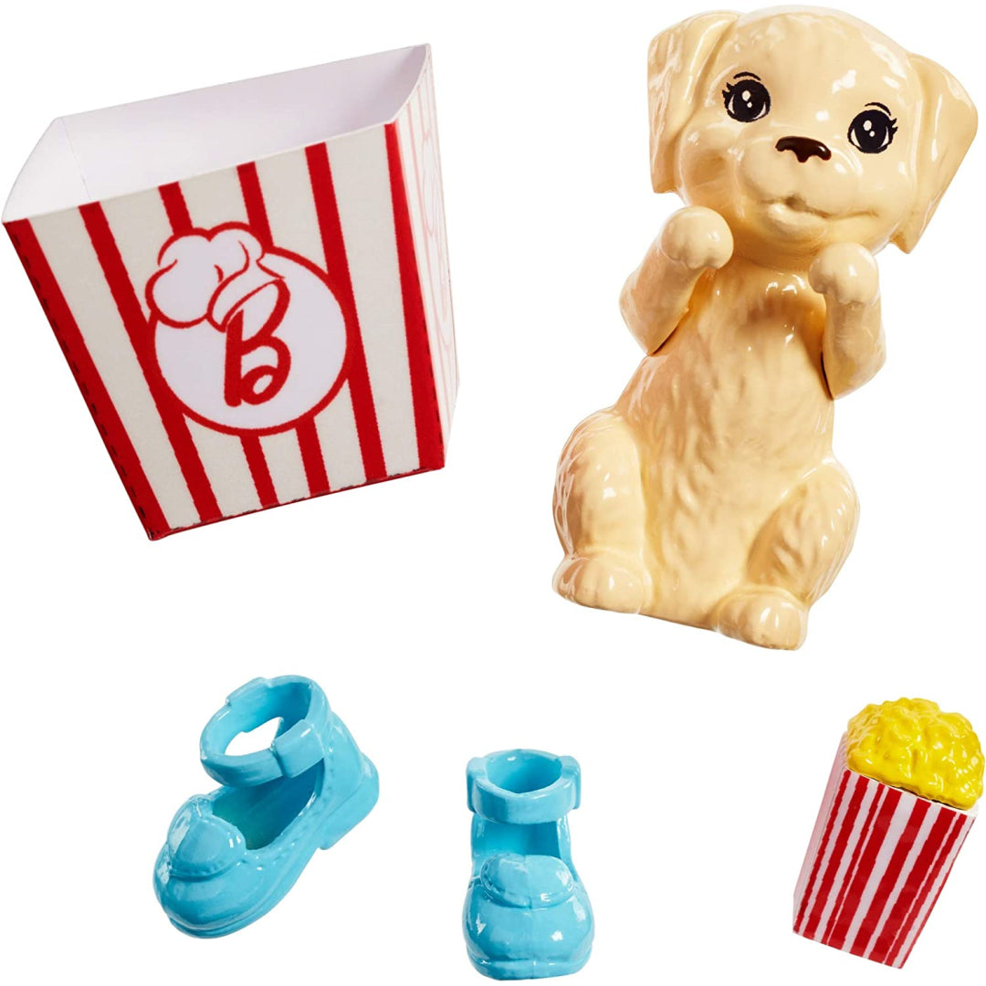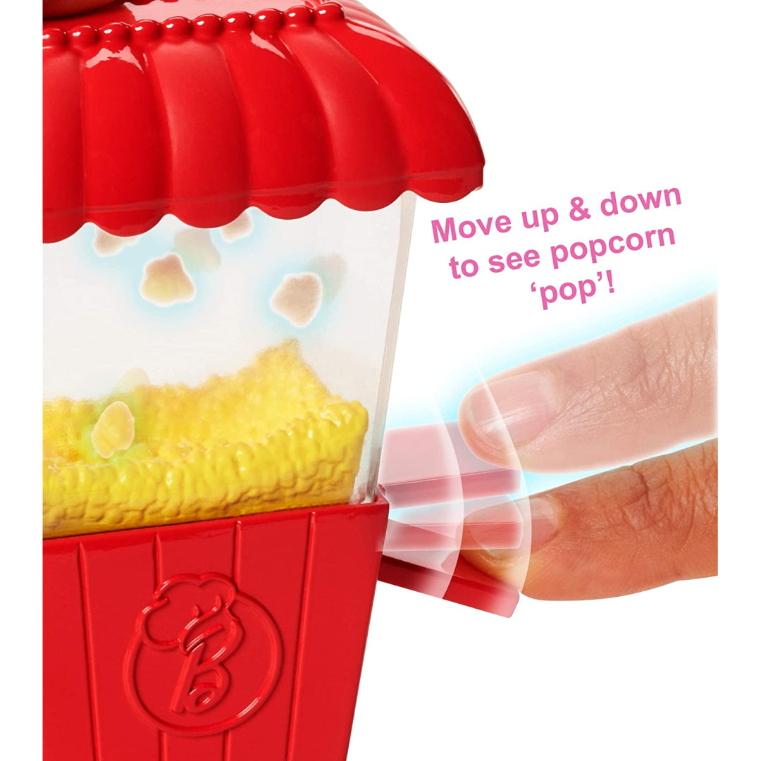 Play and career exploration may get off to a great start with the Chelsea doll and accessories, which allow the younger sister of Barbie to start her own business while bringing her pet along for the ride. The Chelsea doll, a pet figure, and a functional popcorn machine are all included in this popcorn stand play set, which is designed to encourage children to pursue their interests and live out their fantasies through imaginative play. To begin the action, move the lever located on the side of the machine in an up-and-down motion. As the lever is pushed, the popcorn within the machine "pops" with a realistic movement. It is a lot of fun, and the motion makes people giggle and makes them want to use it again and again. There is already a portion of popcorn prepared for you, and it may be placed on the lever, which can also be used as a tray. To provide a more lifelike environment for the lovely dog and to extend the amount of time spent playing, a bigger popcorn box was used. The Chelsea doll is equally as adorable when dressed in bright colours and comes with a detachable skirt as well as shoes. Young minds will have a great time using their imaginations by making up all these tales. Because with Barbie, you can be anyone you want, collecting all of the Chelsea dolls and accessories will give you even more options to play with. consists with a Chelsea doll dressed with a skirt and shoes that can be removed, a "popping" popcorn stand, a dog figure, a popcorn dish, and a pet box.