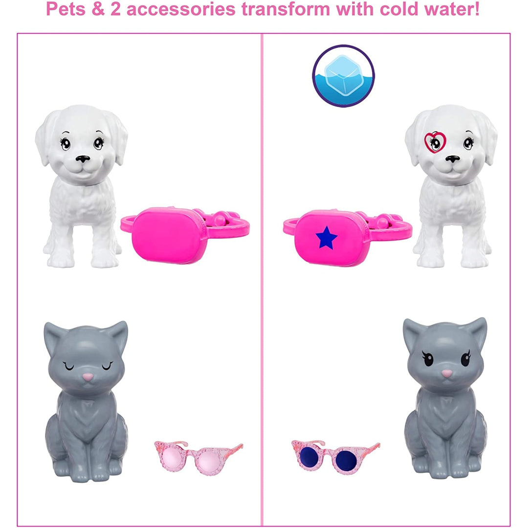 Watch their faces light up as they discover a Barbie doll, two adorable dogs, outfits and accessories hidden within the pop-out compartments. The magic happens when you dip the doll in warm water - revealing a stunning metallic effect and unique look! The same exciting reveal works for both puppy pals too.