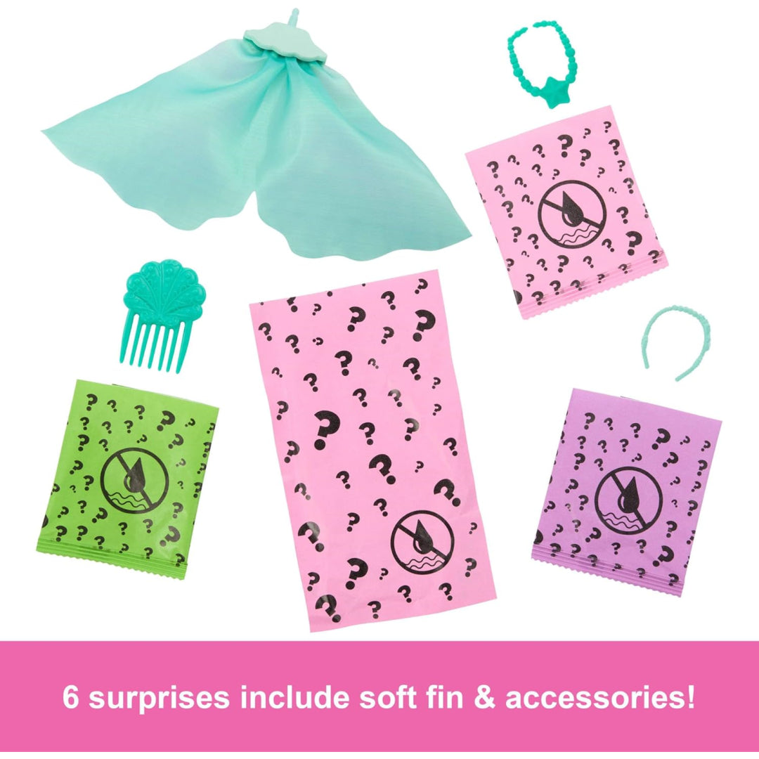 Dive into magical mermaid playtime with this Barbie Colour Reveal doll, perfect for surprising little ones with six exciting unboxing moments. Each tube contains a special Barbie doll coated in sparkly sea spray, ready to reveal her secrets! Watch as warm or cold water transforms her hair into vibrant colours, creating endless moments of wonder and delight.