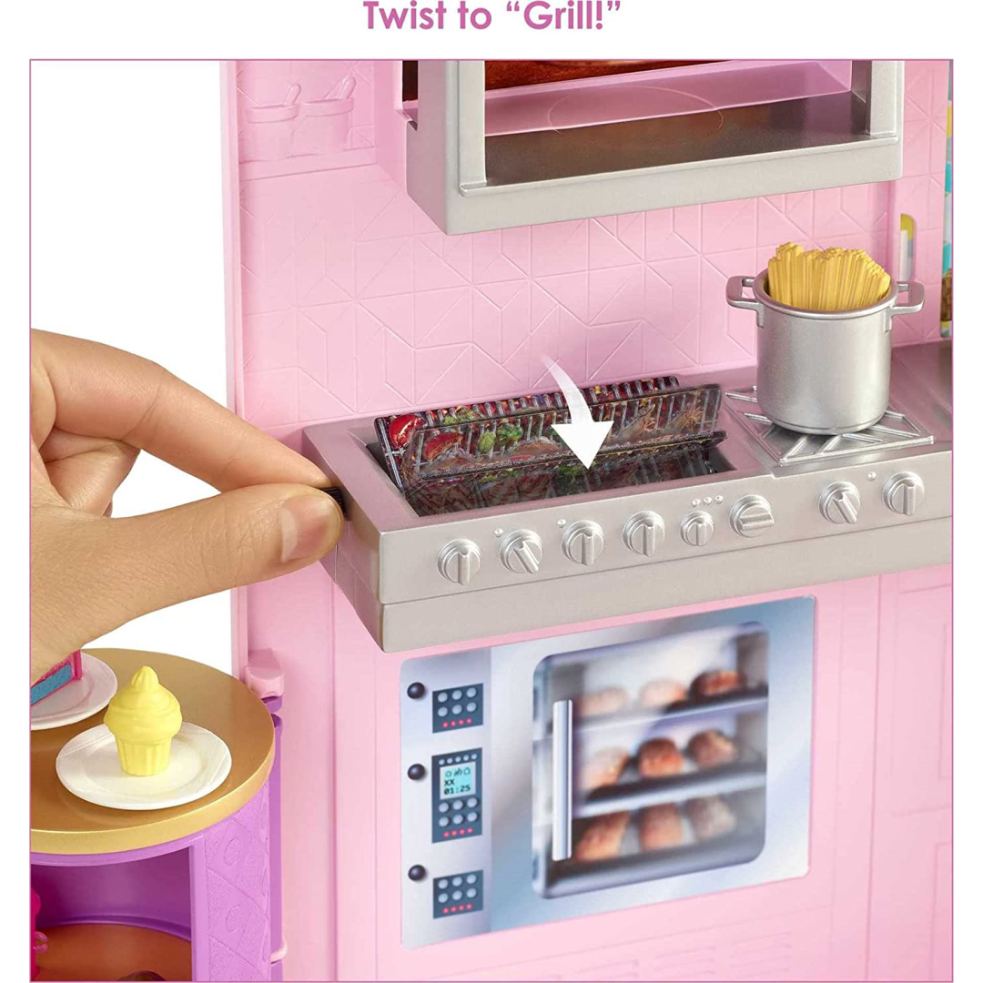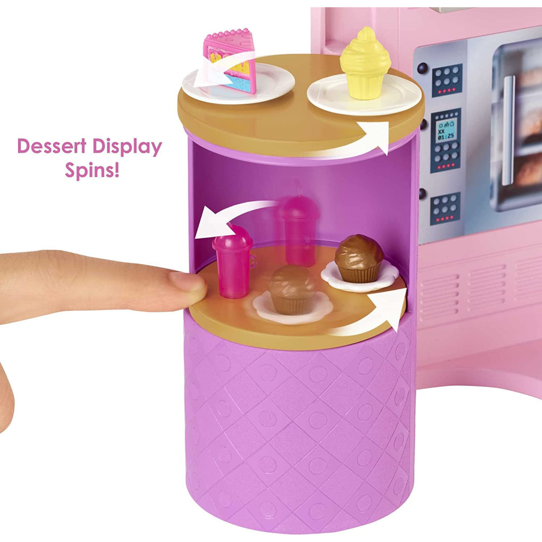 The interactive kitchen features a spinning grill for flipping burgers and a colour-changing pizza oven that brings cooking to life. The rotating dessert display adds an extra sprinkle of excitement to serving sweet treats. Every detail has been thought of, from the cash register and menus to drink dispensers and realistic dining accessories.