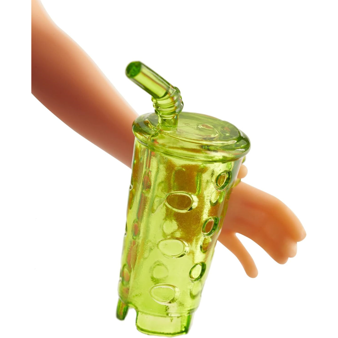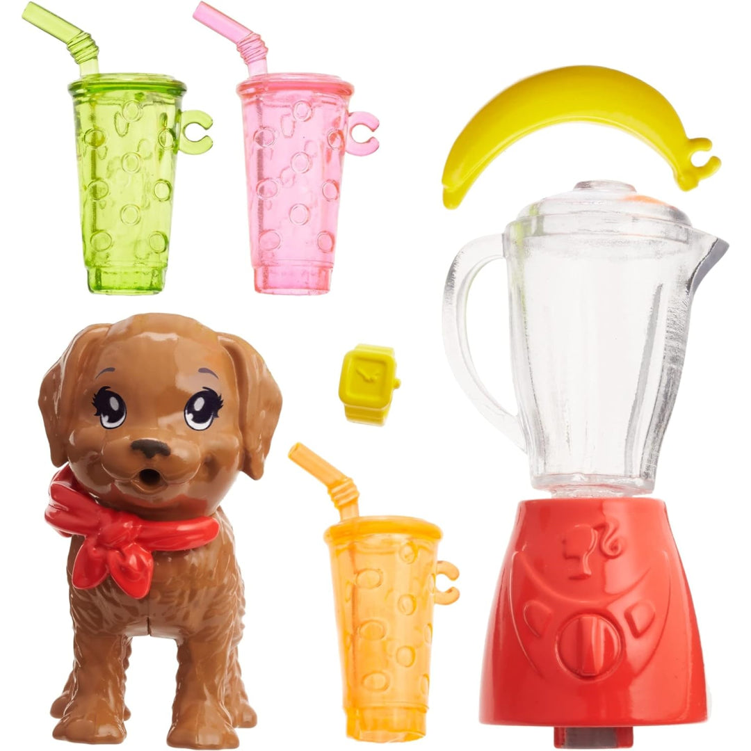 The set includes everything needed for smoothie-making fun: a blender, banana, and three colourful cups with kid-friendly straws. Stacie's furry companion, a brown dog with a charming red scarf, adds an extra dash of cuteness to playtime. The drink accessories are perfectly sized for little hands and compatible with doll handling, making play sessions smooth and enjoyable.