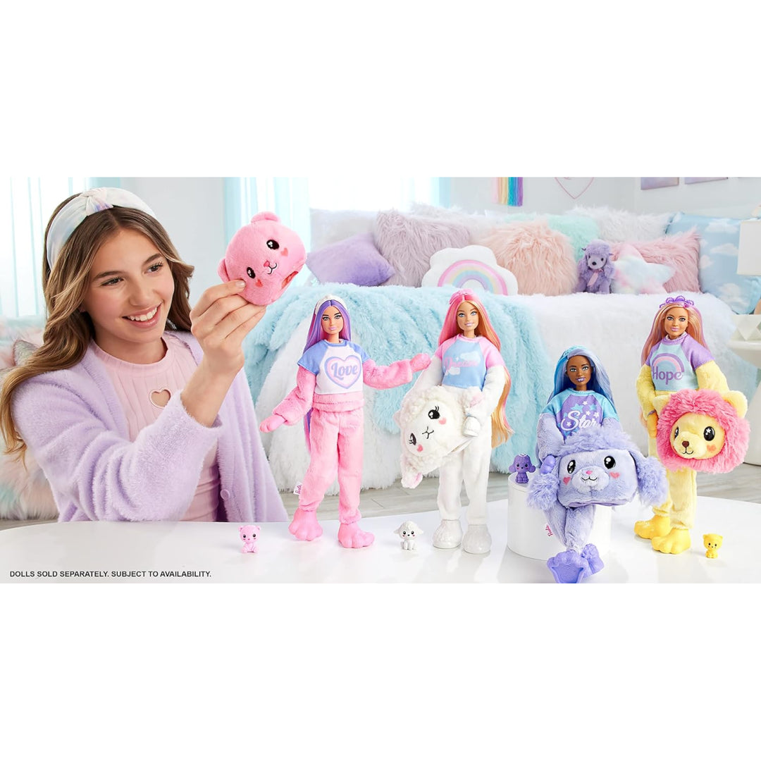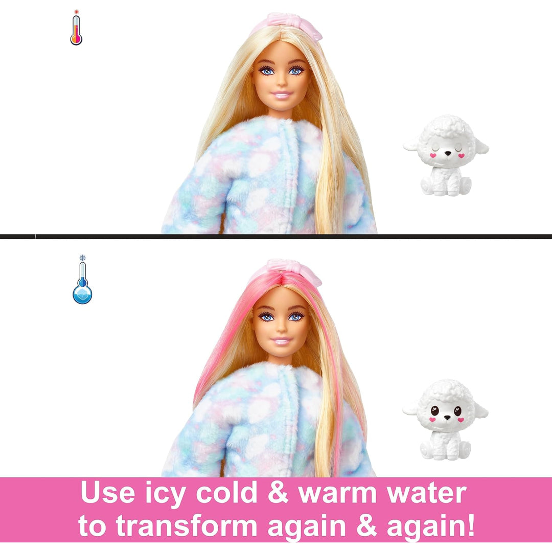 Get ready for a delightful unboxing experience with this Barbie Cutie Reveal doll! Perfect for surprising little ones without breaking the bank, this adorable set brings together cuddly play and fashion fun. Inside, you'll discover a fluffy lamb plush wearing a colourful tee that cleverly hides a posable Barbie doll with trendy pink-streaked blonde hair.