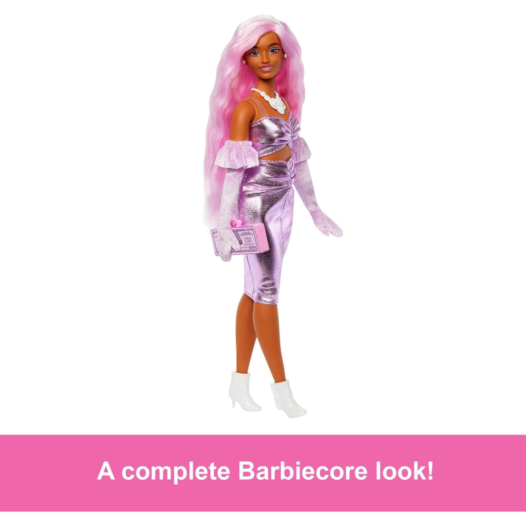 Her eye-catching glossy pink midi dress features fashionable ruched details and a trendy waist cut-out, paired with luxurious velvet gloves for extra glam. The included accessories - a pearly headband, statement necklace, white boots, and money-themed purse - make this doll a complete fashion package. Thanks to her flexible joints, your child can create endless poses and fashion scenarios.