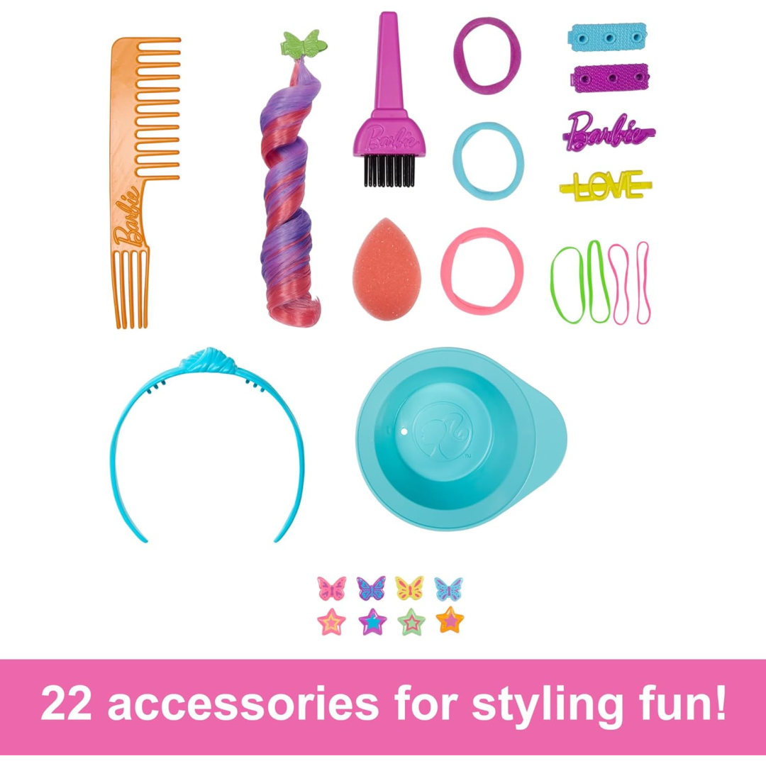 Get ready for amazing value with this Barbie styling head that's perfect for creative play sessions! With stunning brown curly hair featuring eye-catching neon rainbow highlights, this deluxe head offers endless styling possibilities that'll keep the kids entertained for hours. The incredible 22-piece accessory set includes magical colour-changing features - just use warm water to reveal hidden colours in the lips, hair extension, and decorative plug-ins, then switch to cold water for extra surprises!