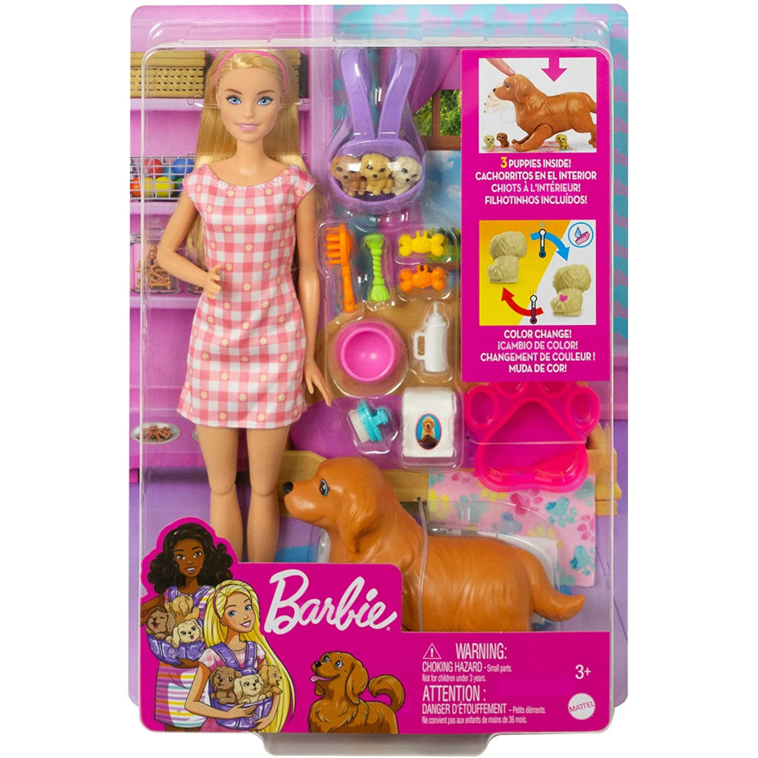 Barbie's lovely pet dog is expecting puppies! When youngsters press down on mommy dog's back with the Barbie Newborn Pups playset, they can help Barbie doll birth three gorgeous newborn puppies.