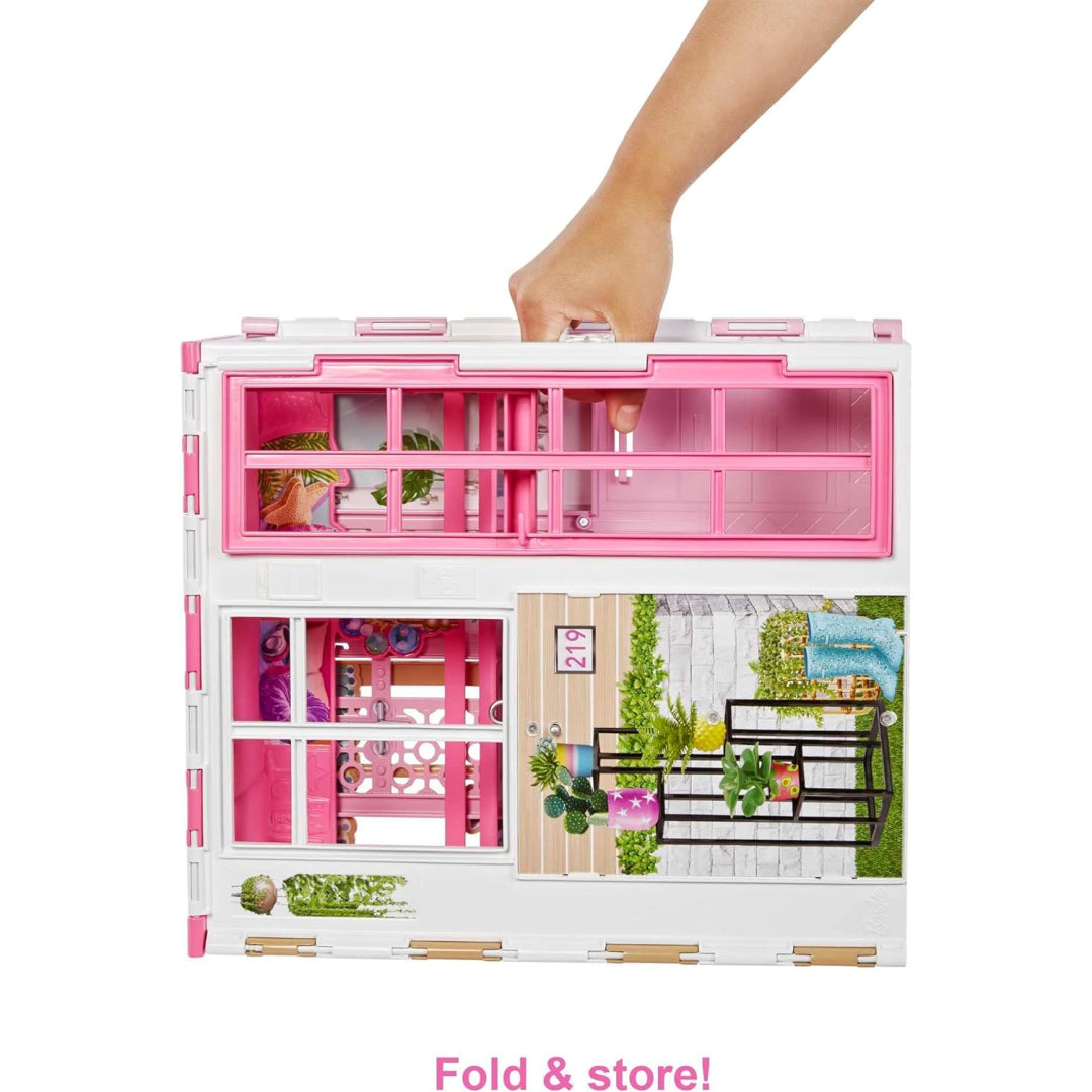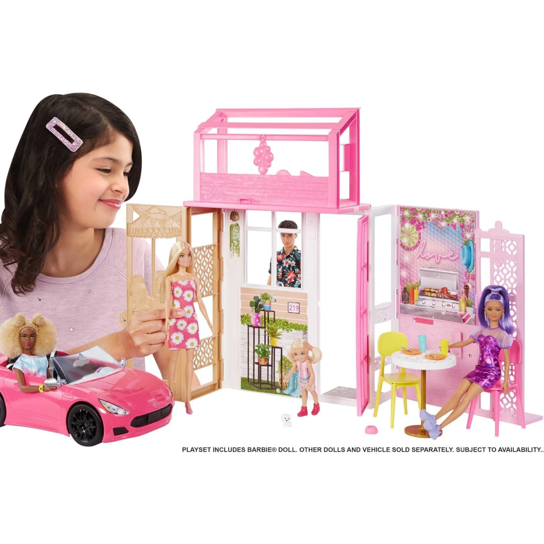 This value-packed Barbie playset includes a doll and her adorable puppy, plus all the essentials for home life - from kitchen accessories to cosy bedroom furnishings. The contemporary design features two dining chairs, plates for hosting dinner parties, and a comfy loft bed for bedtime stories. Best of all, it folds up easily for storage or taking along to playdates!