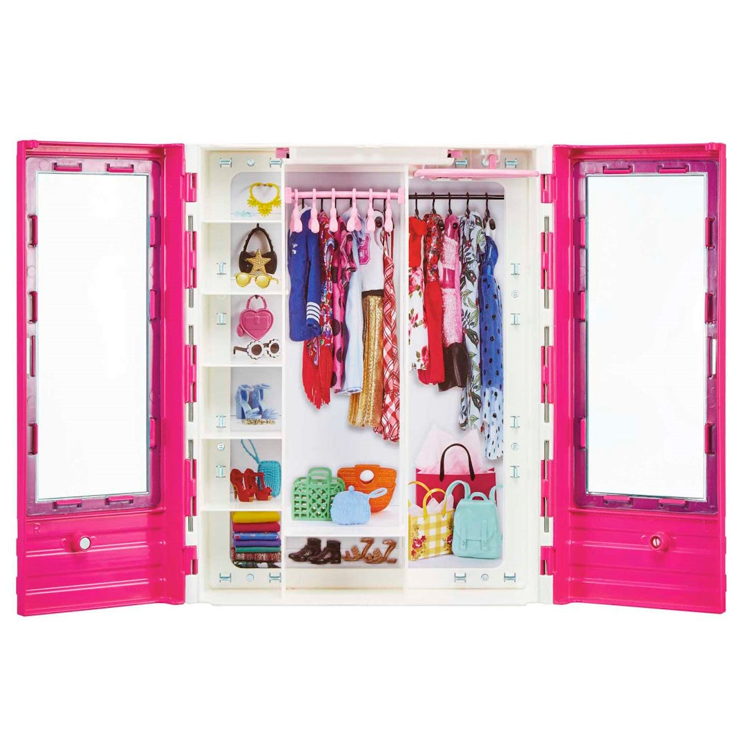 The stylish pink closet features see-through doors and comes with a pull-out clothes rail complete with hangers, making it super easy for little ones to organise their Barbie and Ken's outfits. With a handy carry handle, it's perfect for playroom-to-bedroom transitions or visits to friends' houses. The included 30.40cm dolls come dressed in trendy outfits ready for any adventure!