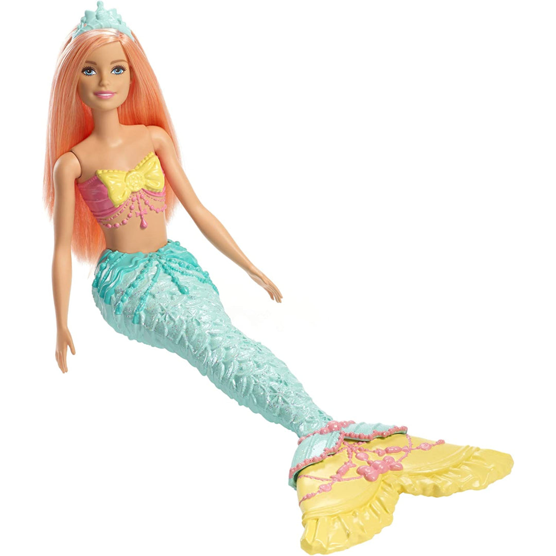Let your little one's imagination take flight with this enchanting Barbie Dreamtopia Mermaid Doll! With gorgeous coral-coloured hair that's perfect for styling and a magical interchangeable teal tiara, this mermaid Barbie brings underwater adventures to life. The shimmering silver glitter tail with candy pink fin accents adds that extra touch of magic that makes playtime special.
