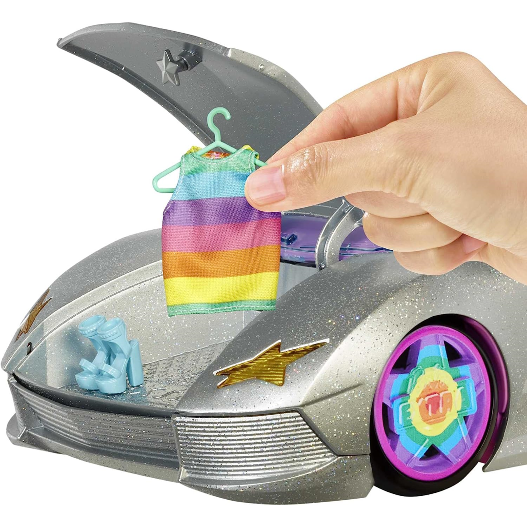 The Barbie Extra Car is equipped with everything the Extra dolls need to ride around in style! The 2-seater sports car features an all-pink interior and sparkly silver exterior with wing-inspired scissor doors, star-shaped headlights and rainbow rims stamped with the Barbie Extra logo.