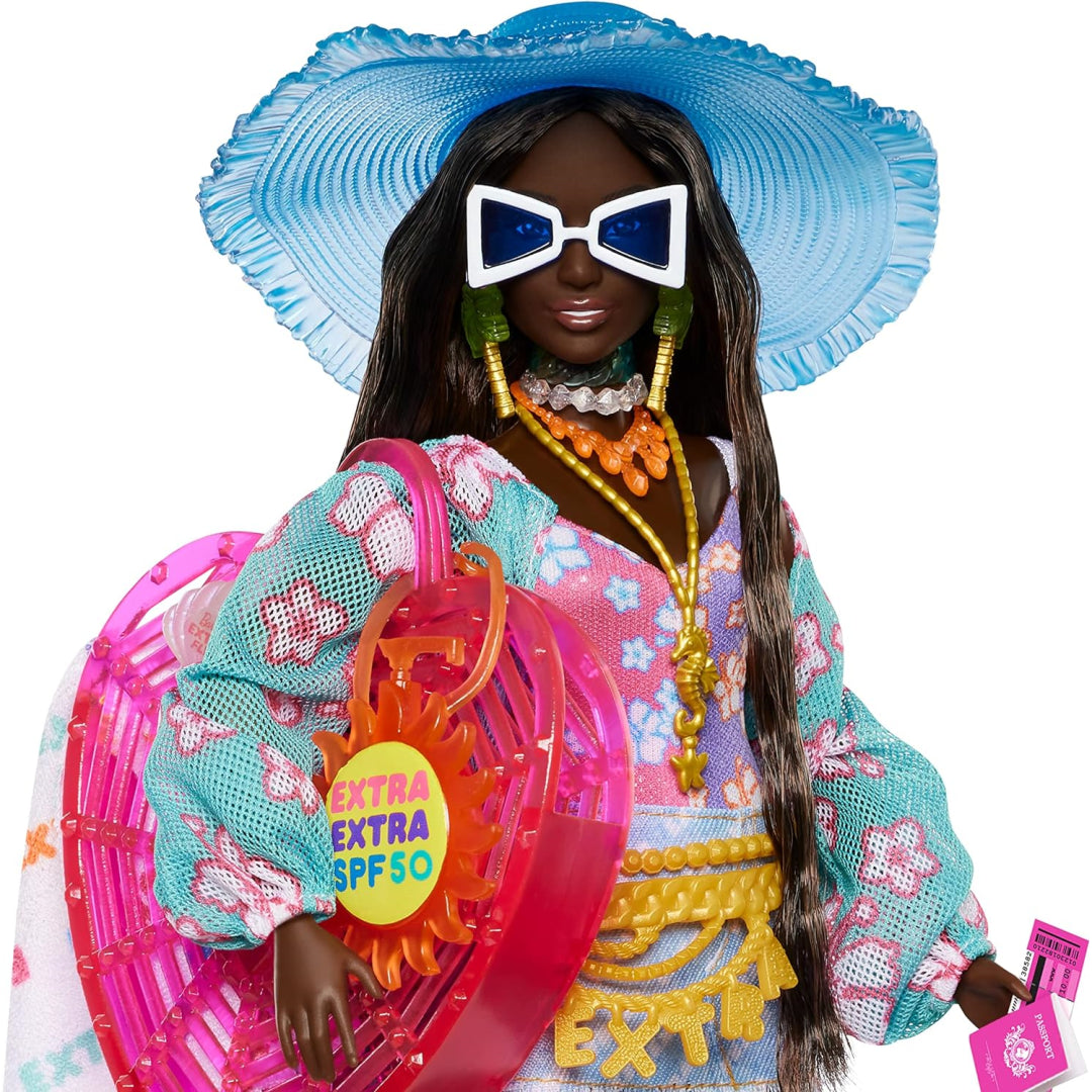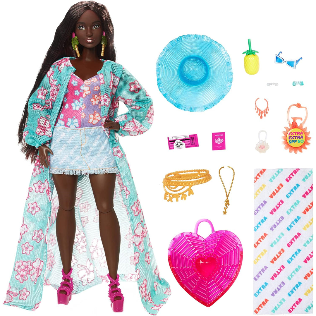 Get ready for epic beach adventures with this Barbie Extra doll that's packed with style and value! Perfect for creative play, this fully posable Barbie comes dressed in a trendy tropical bikini, denim skirt, and fabulous floor-length coverup - ready to make a splash at the beach.