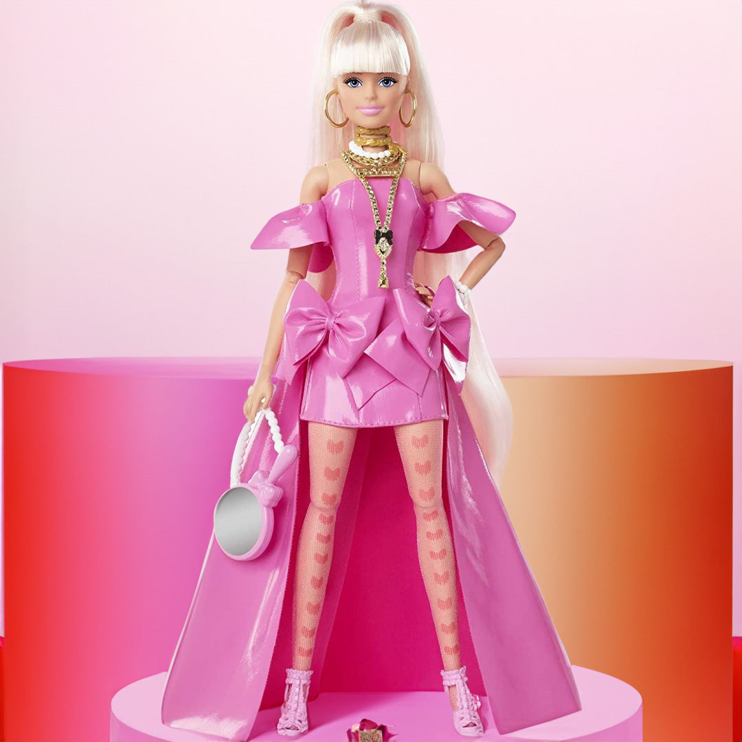 The appearance of the Barbie doll is exaggerated by giving her very long blonde hair with pink highlights and styling her in a high ponytail with bangs. She flaunts her self-assured sense of fashion by donning a pink high-low gown made of quality glossy pleather fabric. The look is finished off with huge bow embellishments and tights printed with hearts. Self-expression and fun with storytelling are encouraged by wearing accessories such as pink ruffle heels, sparkling sunglasses, a portable mirror purse, and plenty of layered, luxurious jewellery.