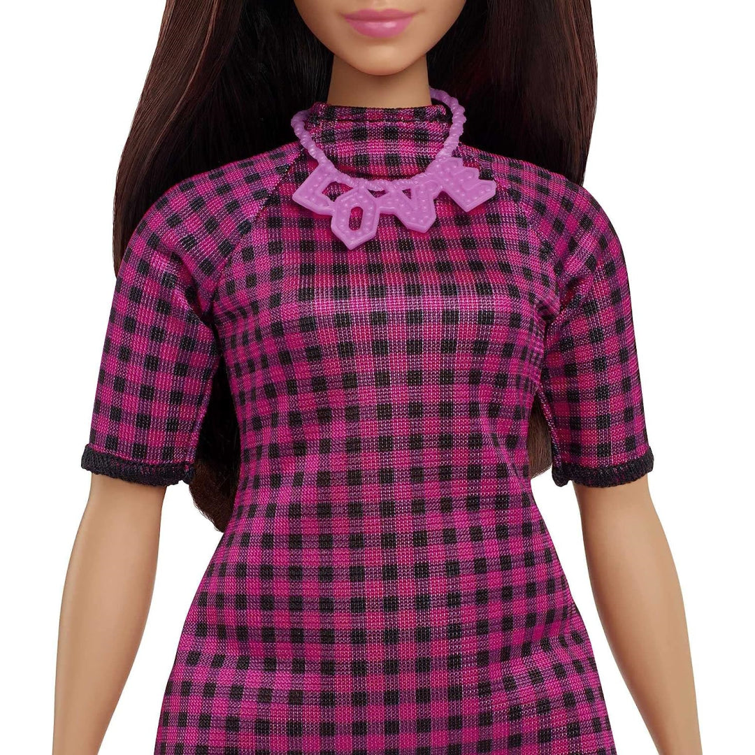 Meet the newest member of the Barbie Fashionistas family! This curvy doll rocks a trendy black and pink checkered dress that's perfect for any occasion. The high neckline with black piping details adds a touch of sophistication, while her sleek black hair perfectly complements her statement pink 'Love' necklace.