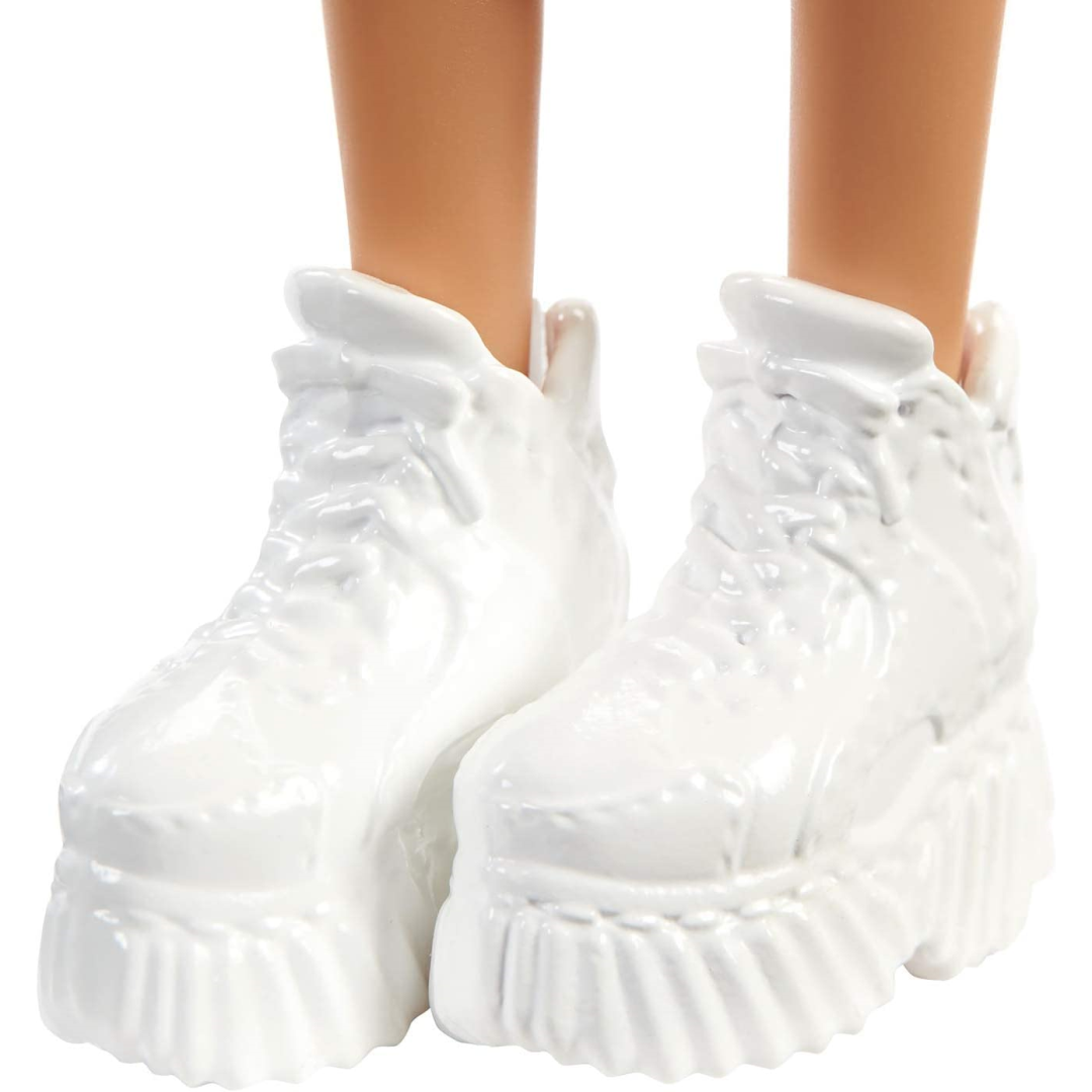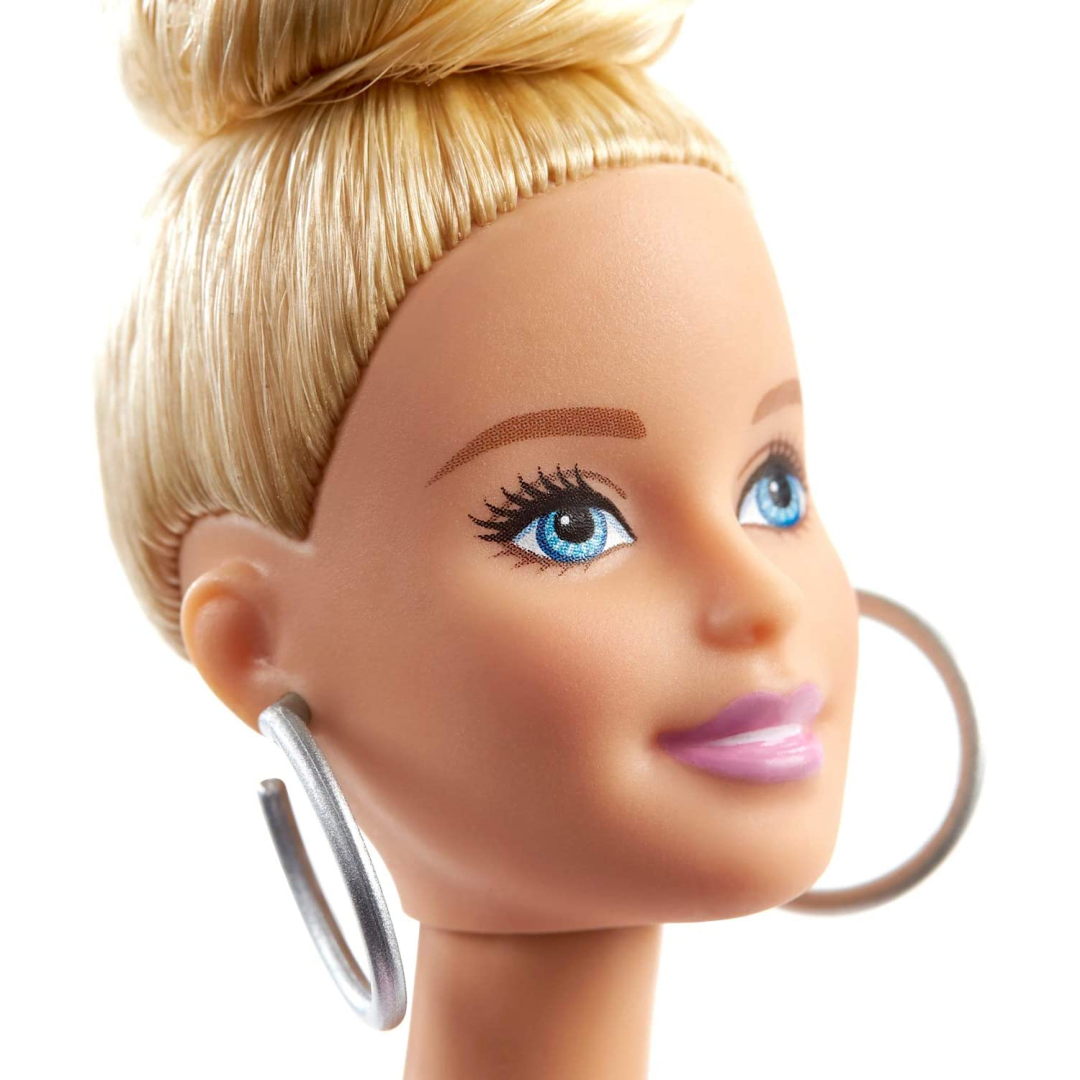 Get ready for fashion-forward fun with this stunning Barbie Fashionistas doll! She's rocking a gorgeous pink and gold checkered ruffle dress that's perfect for any special occasion. Her blonde hair is styled in a trendy top knot that your little one will absolutely adore, while silver hoop earrings add that extra touch of glam. The white platform trainers complete this fab outfit, making her ready for any adventure!