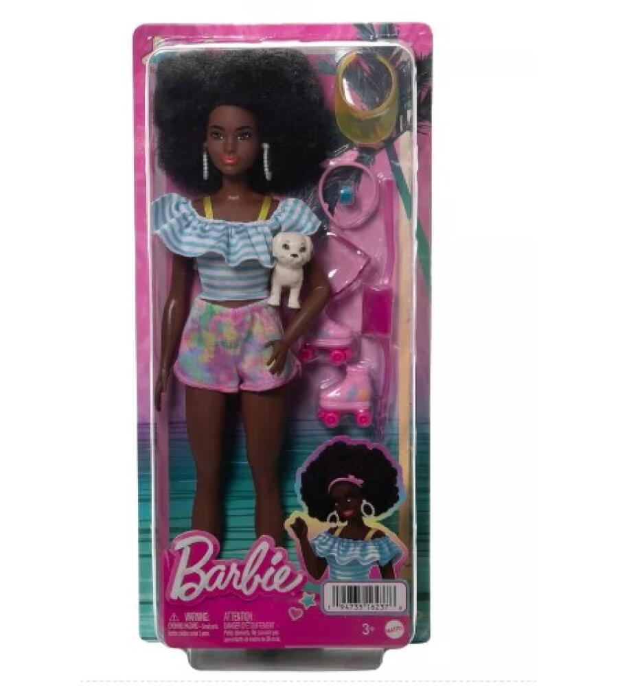Get ready for endless fun with this fabulous Barbie Fashionistas doll! Perfect for imaginative play, this trendy doll rocks a stunning afro and comes complete with her own adorable puppy pal. She's dressed to impress in pastel shorts and a chic off-shoulder ruffled top, accessorised with star sunglasses, a bow headband, yellow visor, watch, and purple belt bag.