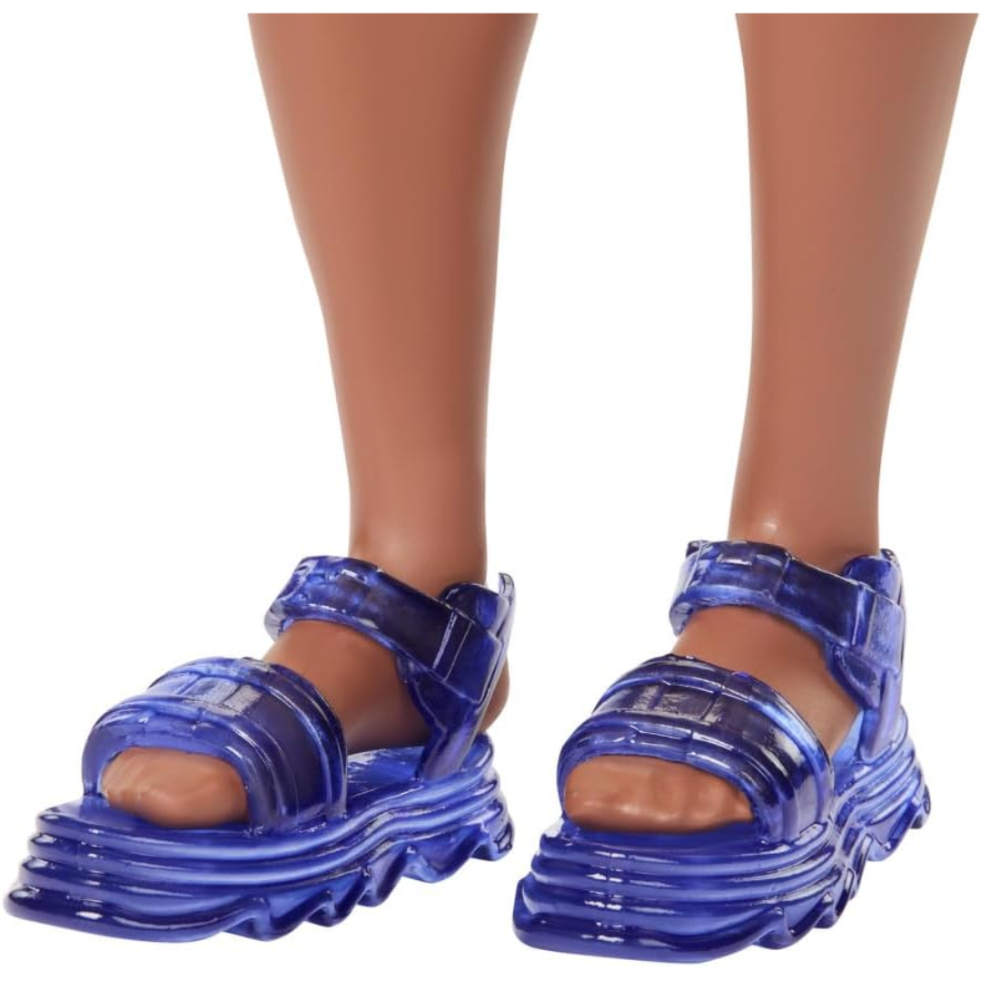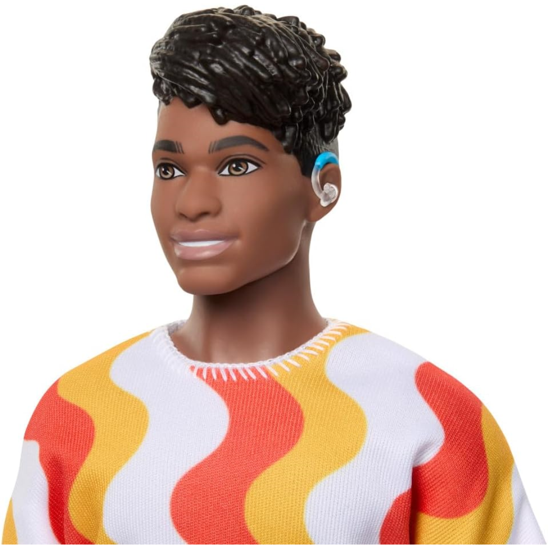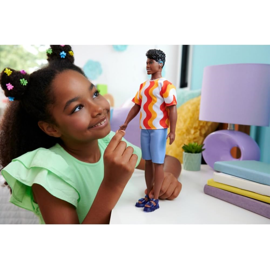 Meet the newest member of the Barbie family! This Ken doll is part of the special 65th Anniversary Fashionistas collection, bringing diversity and real-world representation to playtime. Sporting a vibrant orange and yellow shirt paired with cool blue shorts, this Ken doll rocks behind-the-ear hearing aids and a trendy sculpted black hairstyle. His sturdy build and blue jelly sandals complete his laid-back summer look.