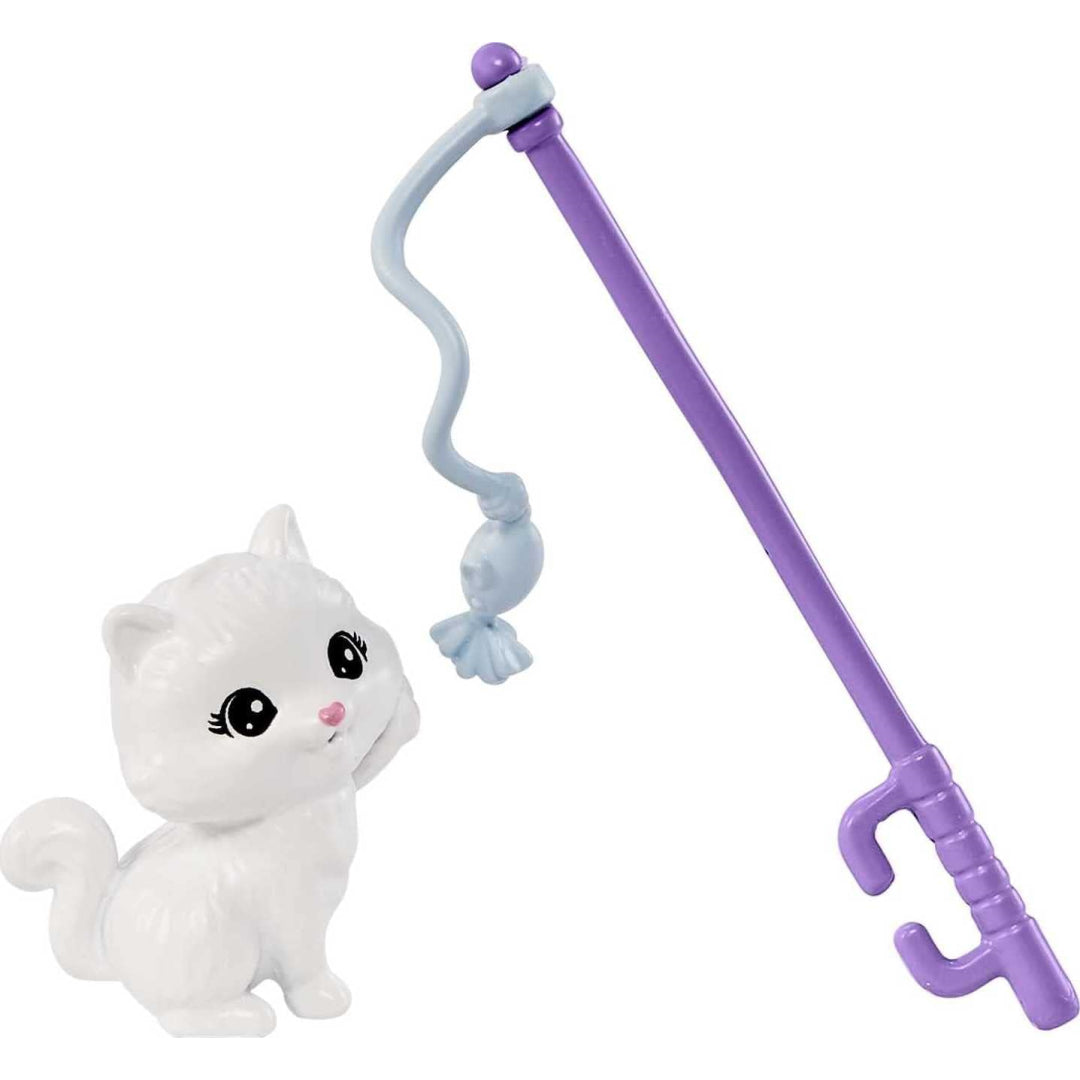 The interactive condo comes packed with engaging features including a peekaboo hiding spot, rotating rope toy, and a detachable basket that doubles as a cosy pet bed. The teaser toy cleverly clips into Barbie's hand for realistic play. Dressed in an adorable pawprint outfit and comfy blue trainers, Barbie is ready for a fun-filled day of kitten care.