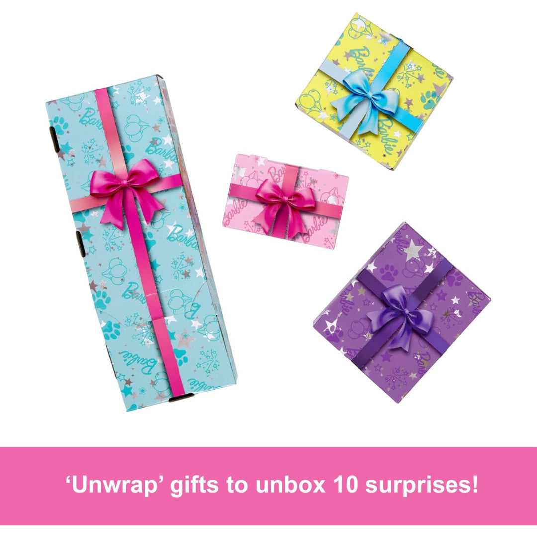 Open up 10 surprises tucked inside 4 stacked presents to discover a blonde fashion doll with pink hair streaks dressed in a gorgeous pink dress with metallic bows and white boots. There's also an adorable mini pet puppy sporting its own pet-sized tutu because every party needs a properly dressed guest. Your little ones will love the unboxing element, making it feel like Christmas morning any day of the week.