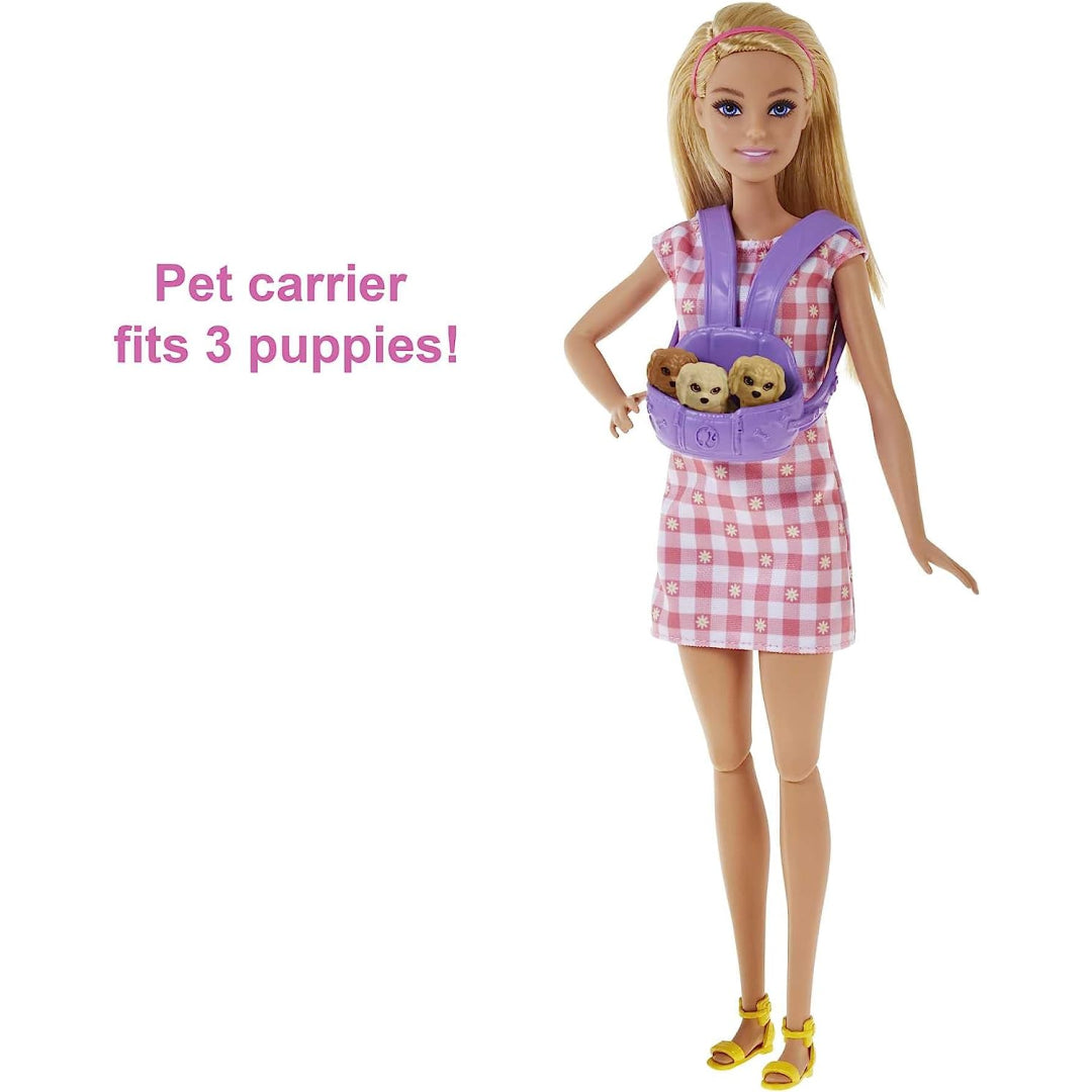 Your little one can help Barbie care for her growing puppy family with the included puppy carrier, perfect for on-the-go adventures. The set comes complete with essential pet care accessories including a bottle, two brushes, a rope toy, treats, dog food, and a feeding bowl - everything needed for hours of nurturing play.