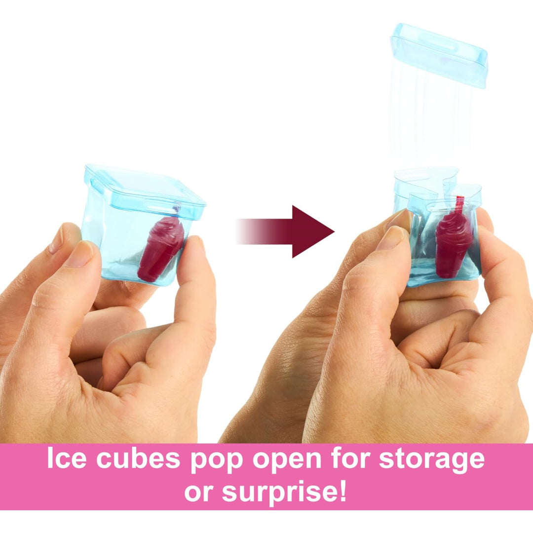 Kids will love the interactive experience of revealing each surprise! Simply open the cup, use the straw to pop the top, and watch as red slime cascades over the ice cubes. Inside, they'll find their new Barbie friend wearing fruit-themed shorts, along with an adorable scented pet dog and matching accessories. The ice cubes hold even more treasures, including roller skates and a mini-drink that really pop open.