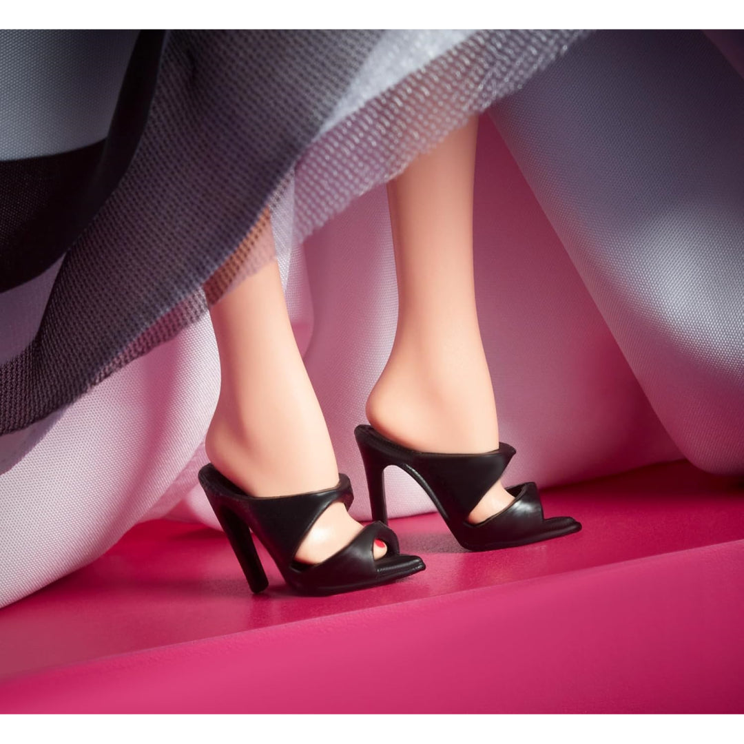 The stunning black-and-white gown takes inspiration straight from the original Barbie swimsuit, reimagined with modern elegance. The fitted sweetheart bodice and voluminous striped skirt create that perfect balance of classic charm and contemporary sophistication, while those long black gloves add an extra touch of glamour. Her waterfall ponytail, cat-eye sunglasses, blue eyeshadow, and signature red lips capture that timeless Barbie look we all adore, topped off with sparkling sapphire earrings that honour this milestone moment.