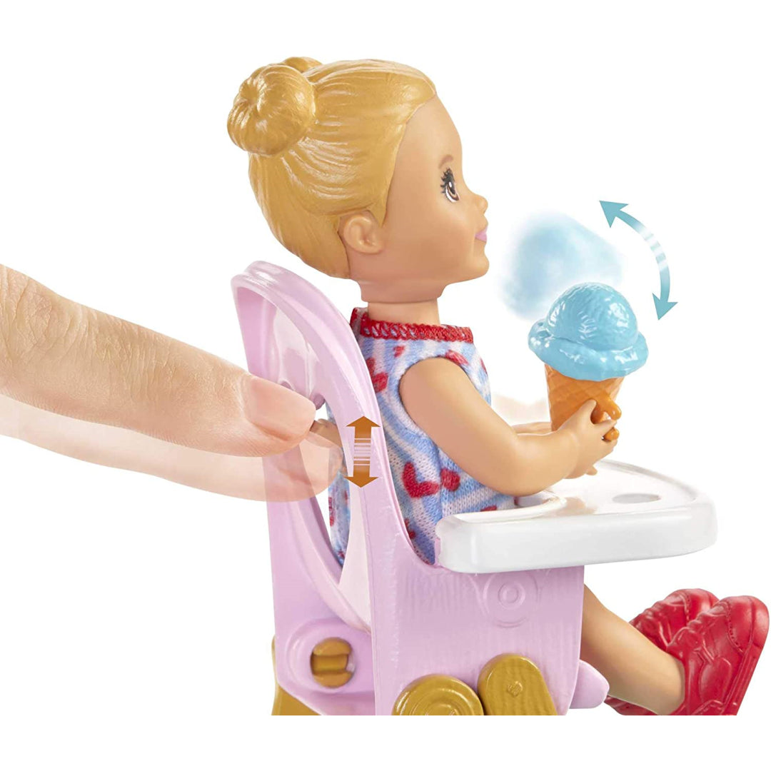 Play out famous babysitting scenarios with this Barbie Skipper Babysitters Inc. playhouse featuring a delightful element that is based around feeding.