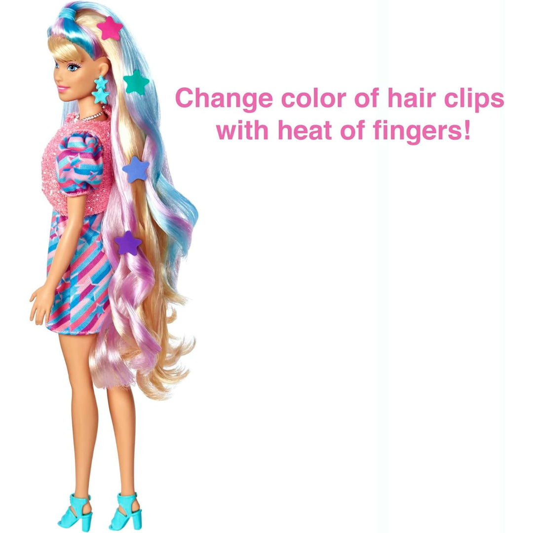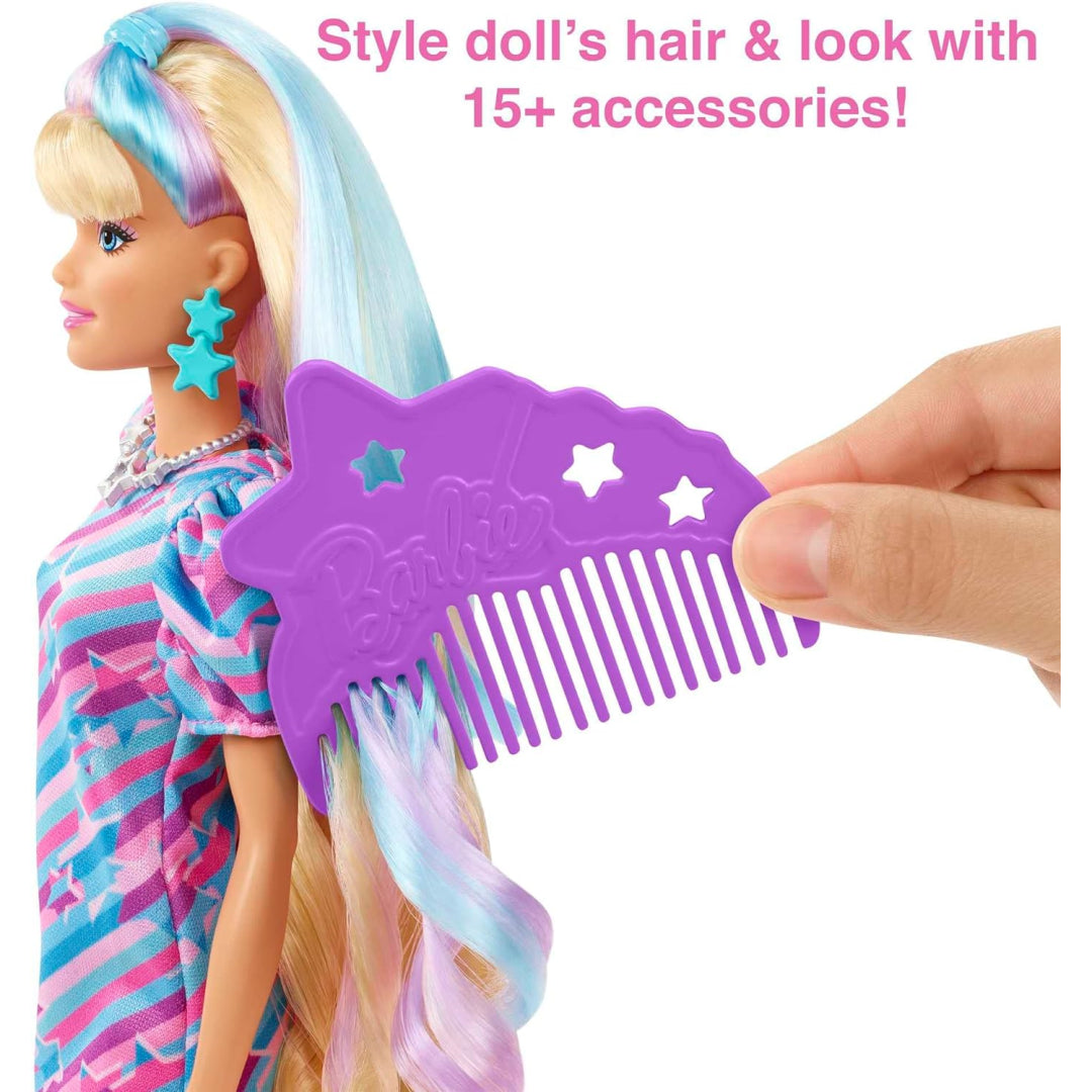 The Barbie Totally Hair star-themed doll commemorates the 30th anniversary of the best-selling doll. With 8.5 inches of extra-long hair, the doll comes with 15+ additional pieces, including Coulour-change hair clips, a comb, hair ties, scrunchies, metallic vest fashion, purse, sunglasses, and a necklace. The star-themed doll features side-swept bangs, purple and blue highlights, and an original body shape. The dress showcases a star print with puffed sleeve detail.