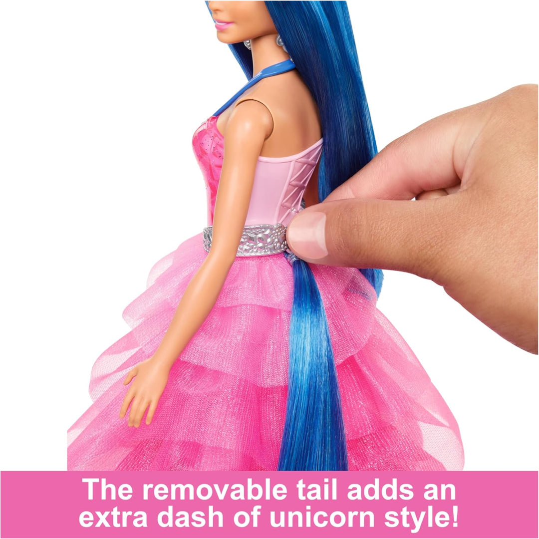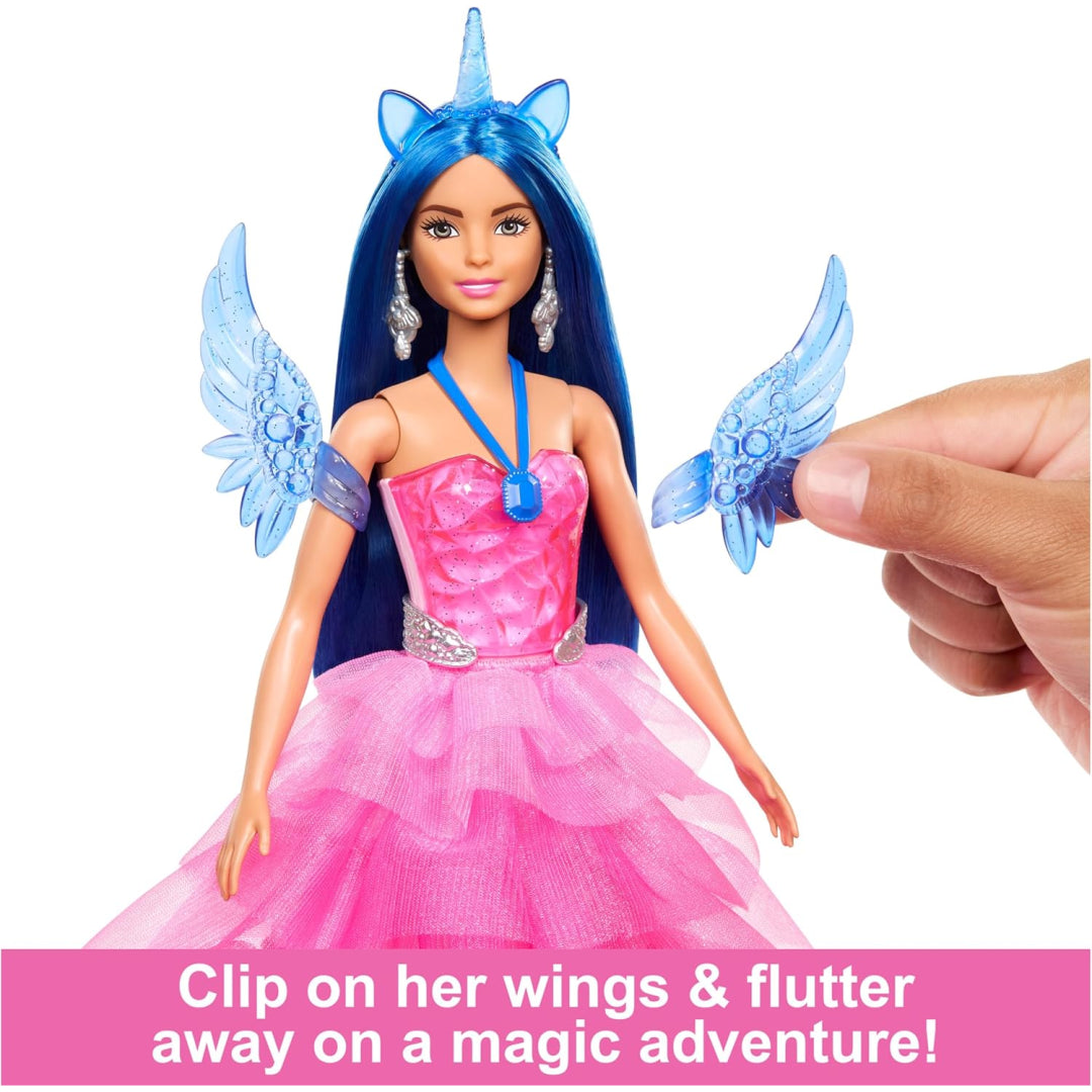 Little ones can style her jewel-toned hair with the included brush, and mix and match her magical accessories including a unicorn headband, detachable sapphire wings, and clip-on tail. Complete with silvery earrings and blue shoes, this special edition Barbie doll brings endless hours of enchanted play.