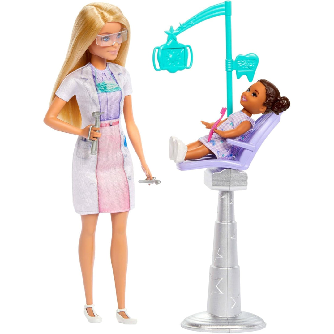 Get ready for hours of giggly dental fun with this amazing Barbie You Can Be Anything Dentist doll set! Perfect for your little one's creative playtime, this value-packed set includes a blonde Barbie doll dressed in a trendy printed dress topped with a professional white lab coat and cool dentist goggles. The adorable patient doll sits comfortably in the included dentist exam chair, ready for their check-up with all the realistic dental tools.