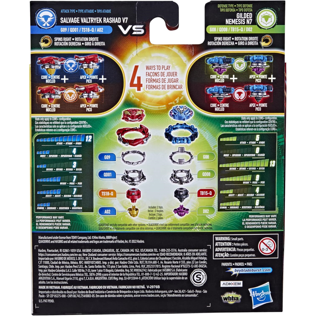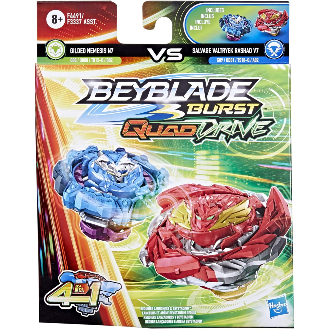 Experience the future of Beyblade battling with Beyblade's QuadDrive technology, introducing the first-ever 4-in-1 top! Each QuadDrive top offers four different configurations, providing you with four strategic options, four customization possibilities, four battle modes, and four paths to victory! Customize your QuadDrive top to gain the ultimate advantage in battle. Train to dominate the arena with the right-spin Salvage Valtryek Rashad (attack/stamina type) and right-spin Gilded Nemesis (defense/balance type) tops. Switch between Core and Apex mode, then Core+ and Apex+ mode to alter the top type. Unlock the full potential of QuadDrive technology with the QuadDrive Beystadium (Beystadium and launchers sold separately, subject to availability).