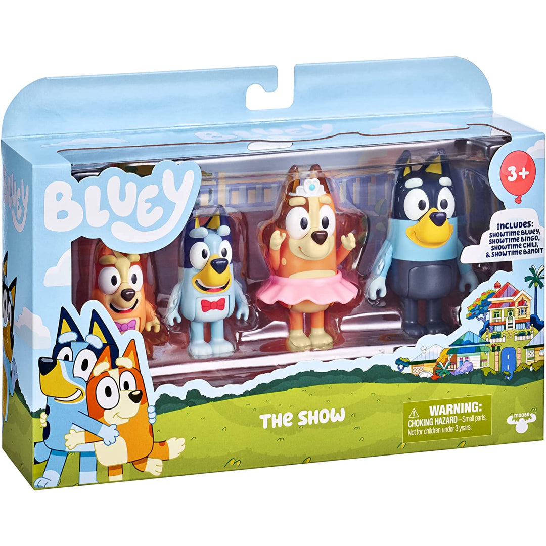 The four-pack of Bluey's "The Show" features Bluey's family members, including Bingo, Chilli (Mum), and Bandit (Dad). Chilli (Mum) has a Tutu that can be removed! The figurines allow for realistic play because to their posability.