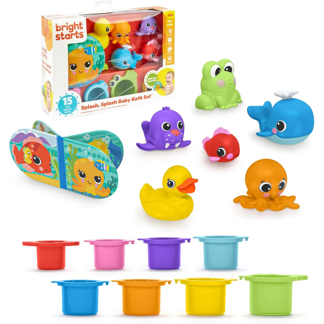 Bath time just got a whole lot more exciting with the Bright Starts Splash Splash Baby Bath Toy Set. This brilliant 15-piece collection brings together everything you need to transform splashing around into proper playtime fun, without breaking the bank. You get the classic rubber ducky (because every bath needs one), five adorable splash friends including a frog, fish, walrus, whale, and octopus, a waterproof book for story time in the tub, plus eight rainbow stacking cups that'll keep little hands busy.