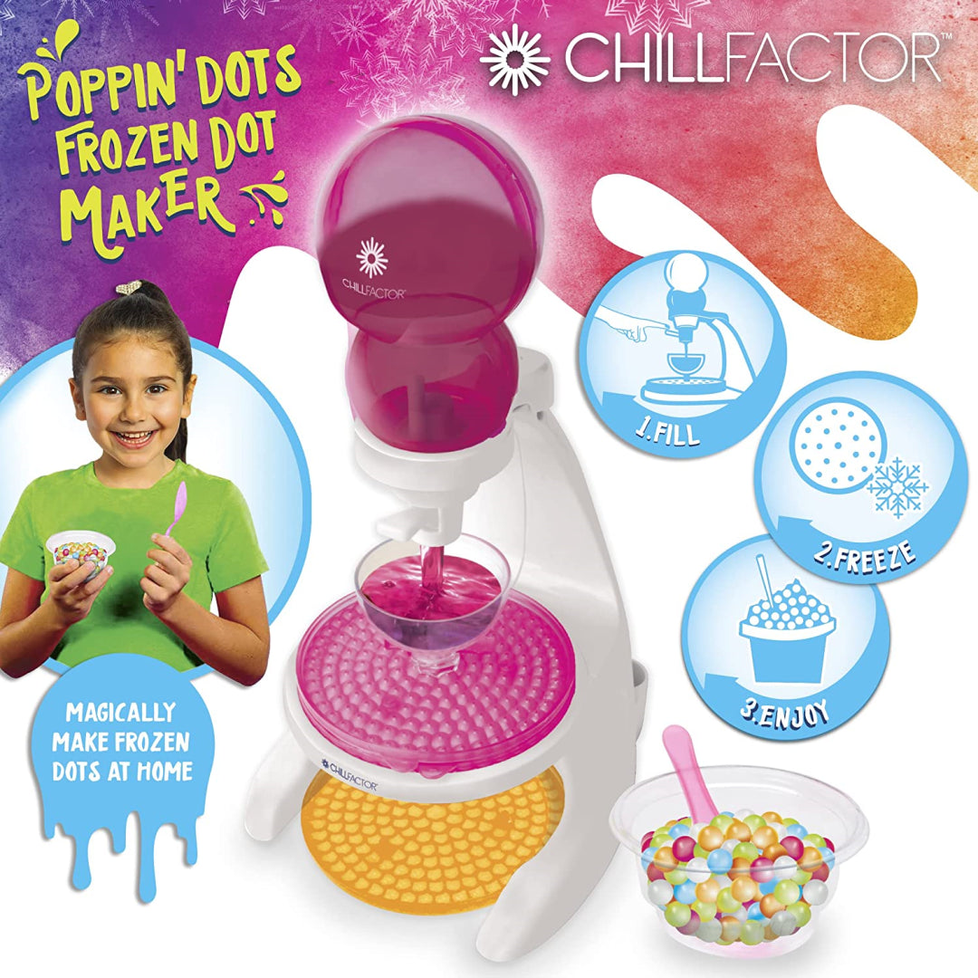 You can make your very own Frozen Dots at home with the help of the ChillFactor Poppin' Dots Frozen Dot Maker, which is an extremely cool piece of equipment. Make your preferred sweet with the help of your preferred beverages; there will be no mess and no fuss. Turning the lever will cause the liquid to be dispensed into the Poppin Dots trays after you have simply filled the unit with your preferred beverage. As soon as your trays are full, place them in the freezer, and after they have sufficiently hardened, you will be able to enjoy your delicious Poppin' Dots. Fill them up, stick them in the freezer, and then dig in and enjoy! Put your creative skills to work by coming up with unique flavour combinations using ingredients such as juice, milk, and yoghurt. You could also make use of the recipe suggestions that have been provided to you as a source of flavour inspiration!