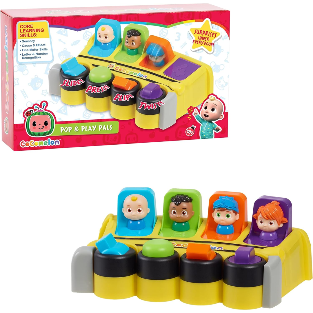 Get ready for learning fun with this brilliant Cocomelon Pop & Play Pals toy that's perfect for your little one's early development! Your toddler will adore playing peekaboo with their favourite Cocomelon friends while learning colours, numbers, and letters. Each chunky control is designed for tiny hands to master - twist to find Cody, press to see JJ, flip to discover TomTom, and slide to meet YoYo!
