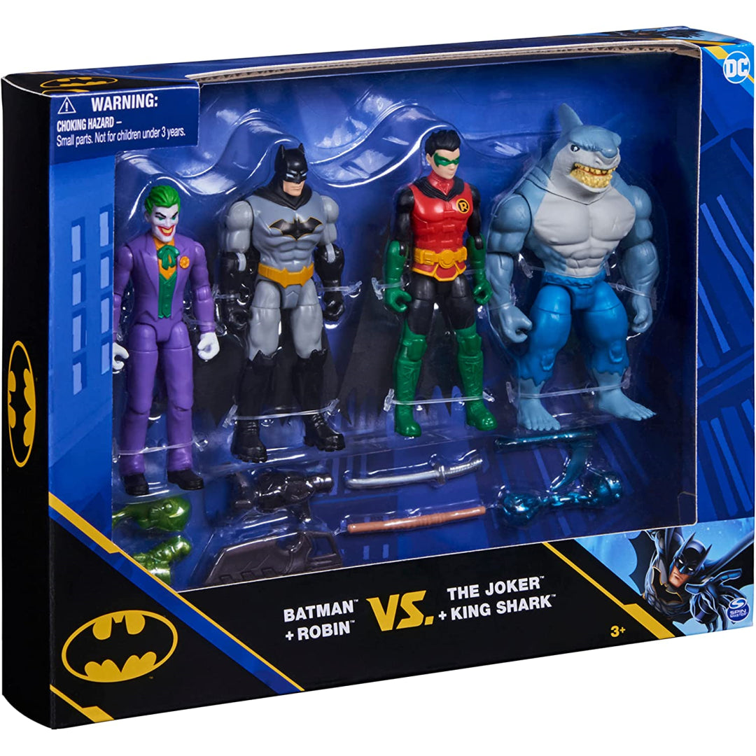 Get ready for epic family-friendly battles with this fantastic value 4-pack of Batman action figures! Perfect for creative playtime, this set includes the dynamic duo of Batman and Robin, ready to face off against The Joker and King Shark. Each 4-inch figure features authentic comic-style details and multiple pose positions, letting your little heroes create their own Gotham City adventures right at home.