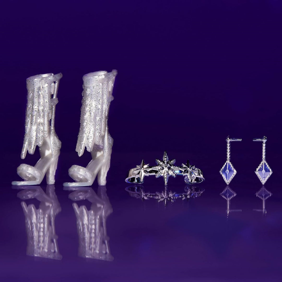 This special collector's piece comes complete with sparkling details that make it truly magical. The matching cape and icicle-inspired accessories add that extra touch of winter wonder, while the crystal-like earrings and decorative belt bring the elegant styling to life. The included display stand means you can showcase this beautiful doll in all her glory.