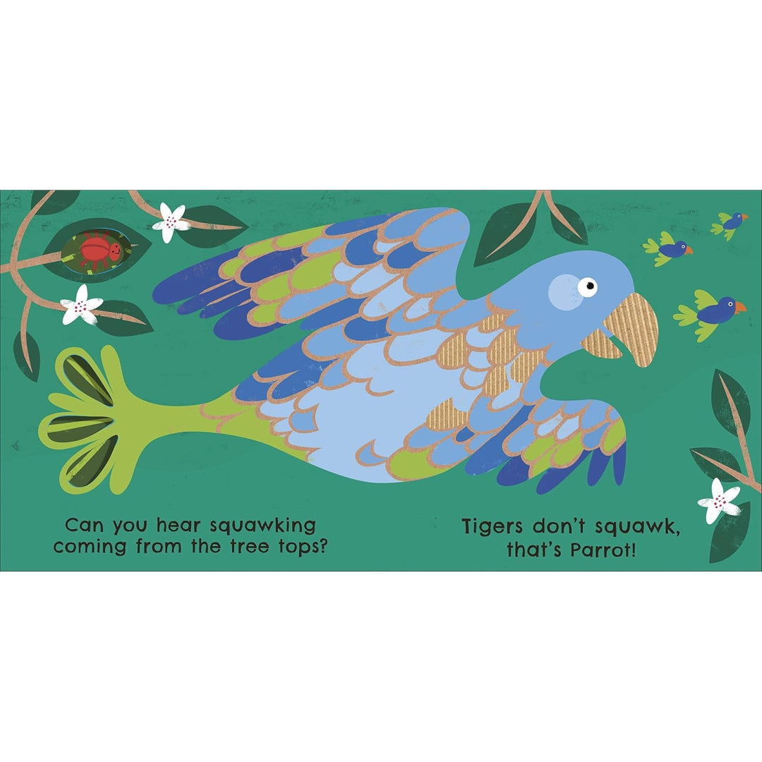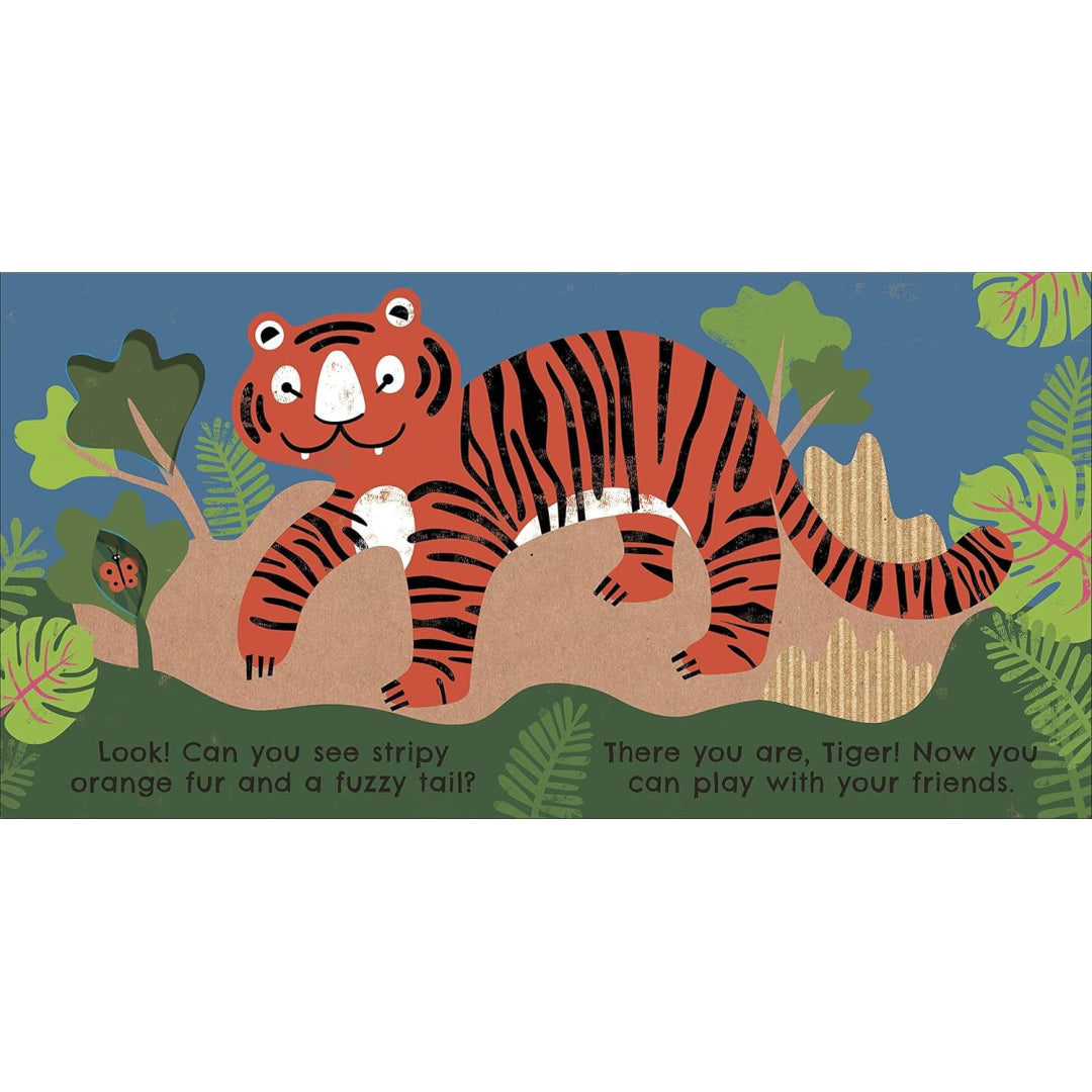 Watch your toddler's face light up as they meet endangered animals in their natural habitat. They'll love feeling their way through the jungle, encountering friendly elephants by the river, chatty parrots in the treetops, gentle rhinos, and swinging orangutans. The suspense builds with each turn of the sturdy page until the final exciting reveal of Tiger!