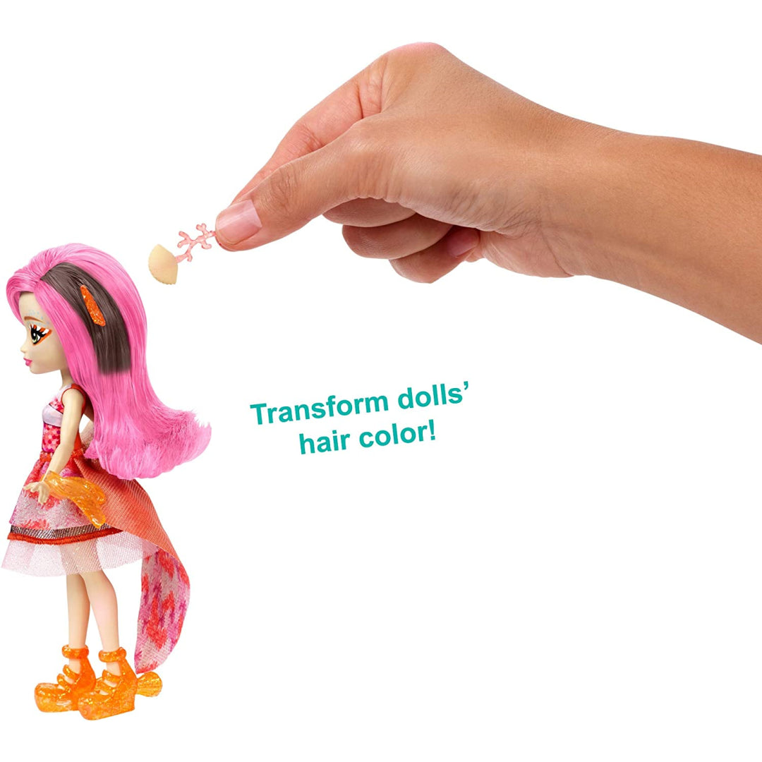 Clarita Clownfish doll is decked up in a shimmering attire that is inspired by the sea. She is decked out in an orange and pink bodice that is adorned with scale-like features, and she has matched it with a sea-flower patterned skirt that can be removed. Her colourful getup is finished off with glittery sandals that have straps. The most captivating feature about her is the way her hair changes colour. You can magically change her hair from bright pink to dark brown by using cold water, and you can turn it back to brilliant pink with warm water. In order to encourage even more imaginative play, the doll set includes a sparkly fish bowl that can be used to contain water as well as a seashell applicator that can be used to colour the doll's hair in streaks or all over. It even includes a handle that looks like coral and can be inserted into the fin of the Cackle figurine!