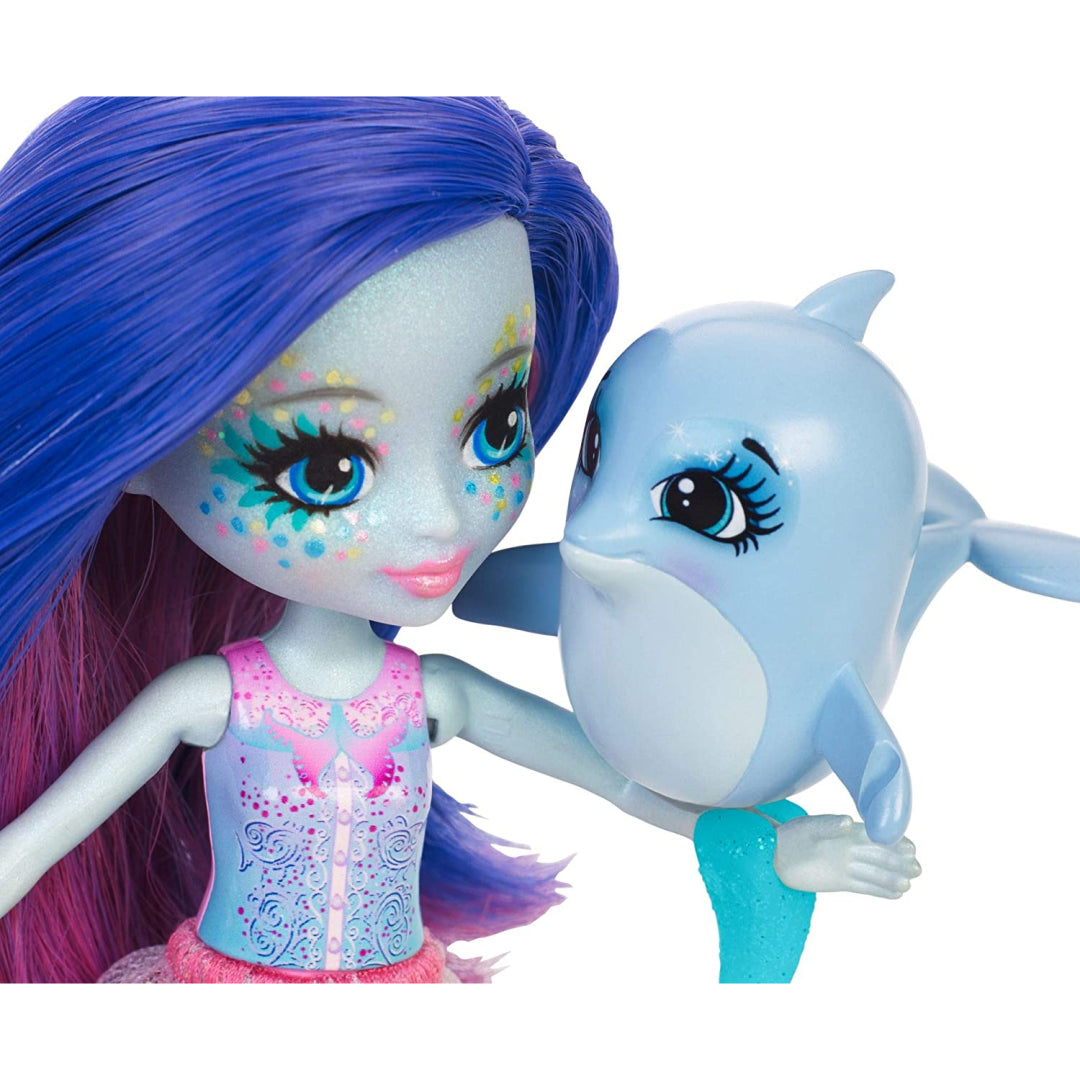 Dive into magical underwater adventures with the Enchantimals Dolce Dolphin doll and her adorable companion Largo! Perfect for creative playtime and imaginative storytelling, this 15cm doll features a stunning ocean-inspired outfit complete with a removable skirt that mirrors a dolphin's tail. The sparkly ensemble includes a detailed top, glittering peplum, turquoise shoes, and a white crown that's sure to delight.