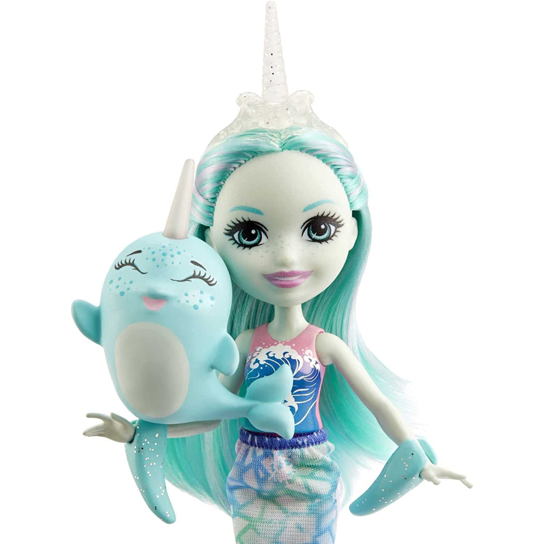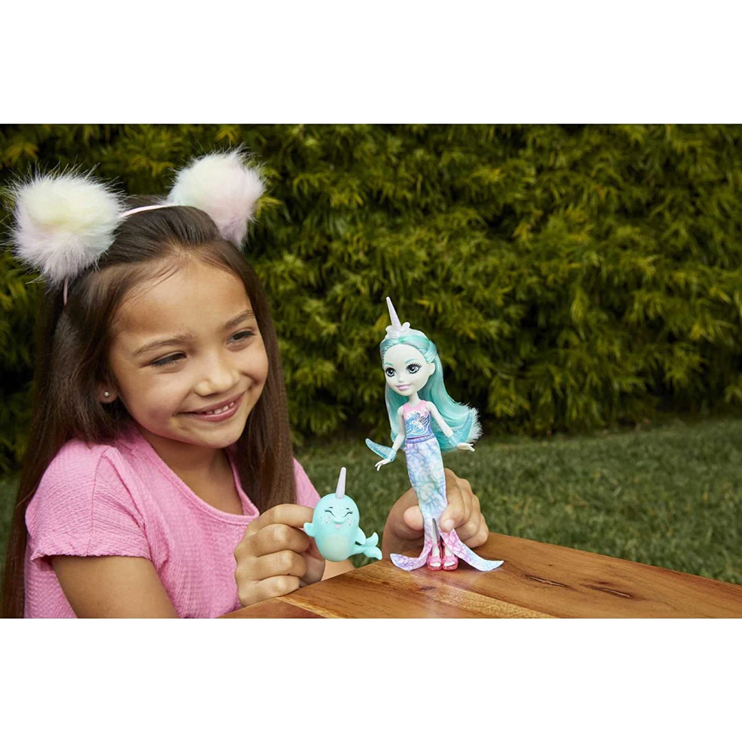 Enjoy the company of these delightful Enchantimals creatures as you learn about the enchantment of friendship and the outdoors. They are constantly together, and they look identical as well. The Naddie Narwhal doll, which is six inches tall, comes with Sword.The Naddie Narwhal doll comes with a mermaid skirt and sandals that can be removed for more play value in the world of fashion. She and Sword both include magical finishes that stimulate children's use of their imaginations, such as their glittery narwhal teeth horns and fins. Children of all ages will have a great time acting out the unique friendship that exists between these two.