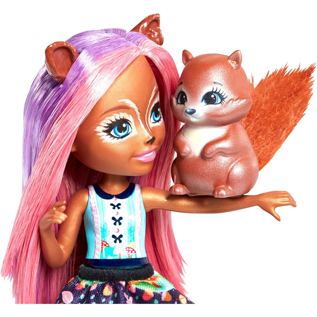 You are about to be enchanted by the wonderful friendship experiences that the Enchantimals dolls have in store for you. These endearing characters collaborate with one another to bring about equilibrium, peace, and harmony among all living things. Somewhere between human and animal, each doll celebrates the distinct characteristics and personalities of both herself and her animal buddy by engaging in rituals together. With this Sancha Squirrel doll measuring six inches tall and her animal companion figure named Stumper, you can act out these traditions, unique ties, and exciting experiences!