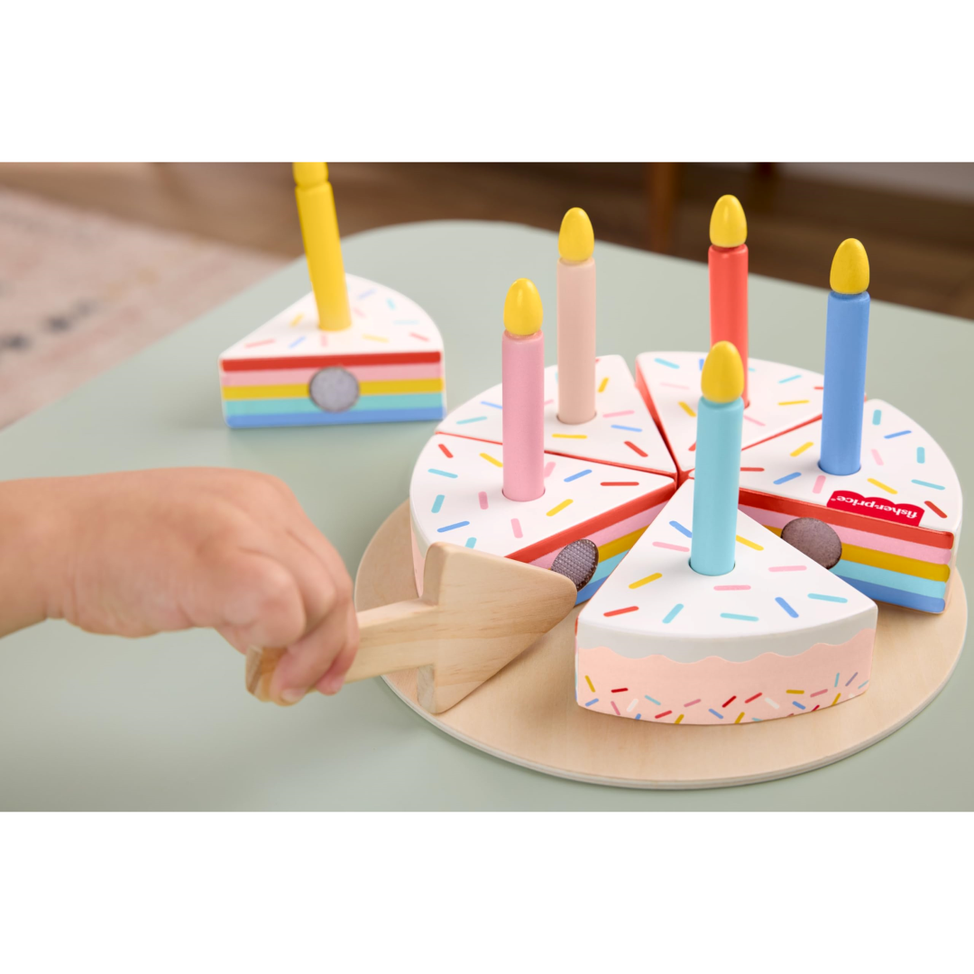 Every play day is a party with this Wooden Cake Set from Fisher-Price. This 14-piece pretend food playset includes 6 slices of cake that attach together, plus 6 removable candles, a serving tray and cake knife. Kids will love decorating, “slicing,” and serving cake for endless celebrations. Each piece is made with wood from Forest Stewardship Council-certified sources (FSC-N004566) and decorated with non-toxic, water-based paint. Not intended for use with real food. Colors and decorations may vary. Wooden cake playset for decorating and serving pretend play, 14 pieces! Includes 6 cake slices, 6 removable candles, serving tray and serving utensil. Slices attach together to create the whole cake. Made with wood from Forest Stewardship Council-certified sources (FSC-N004566) and decorated with non-toxic, water-based paint. Encourages imaginative play while helping to foster relationship skills and expressive language for preschool kids ages 3 years and older.